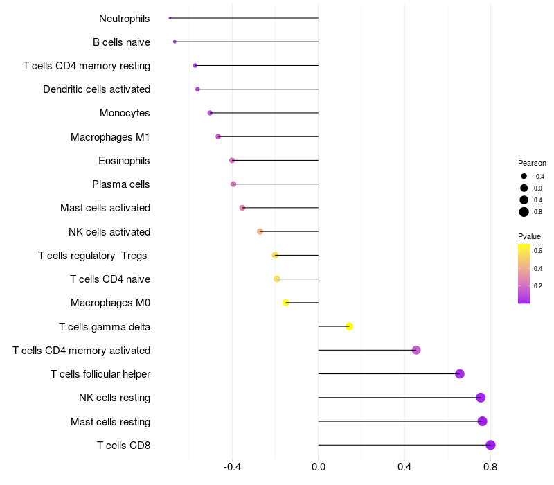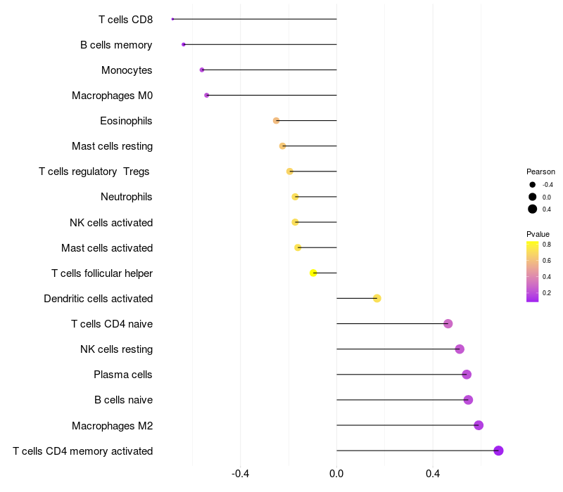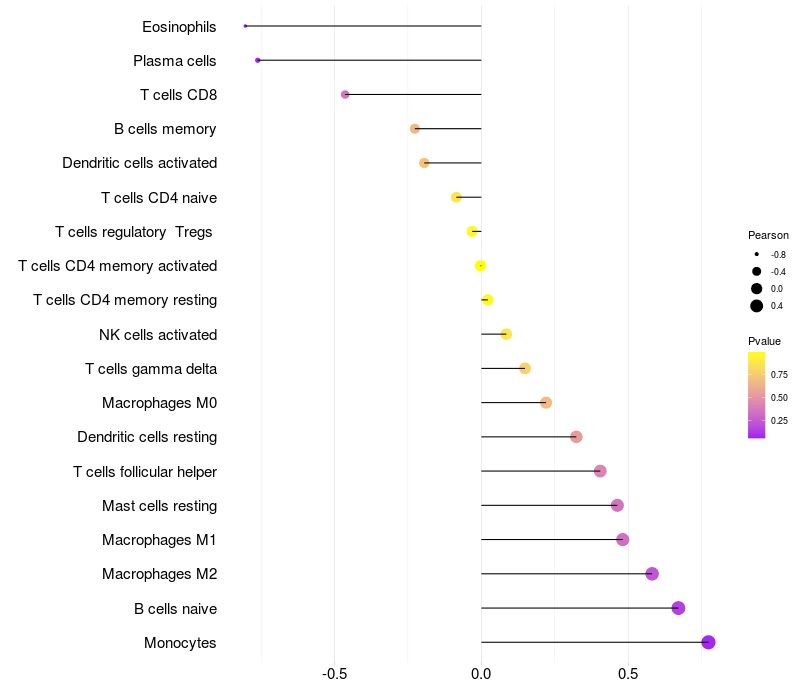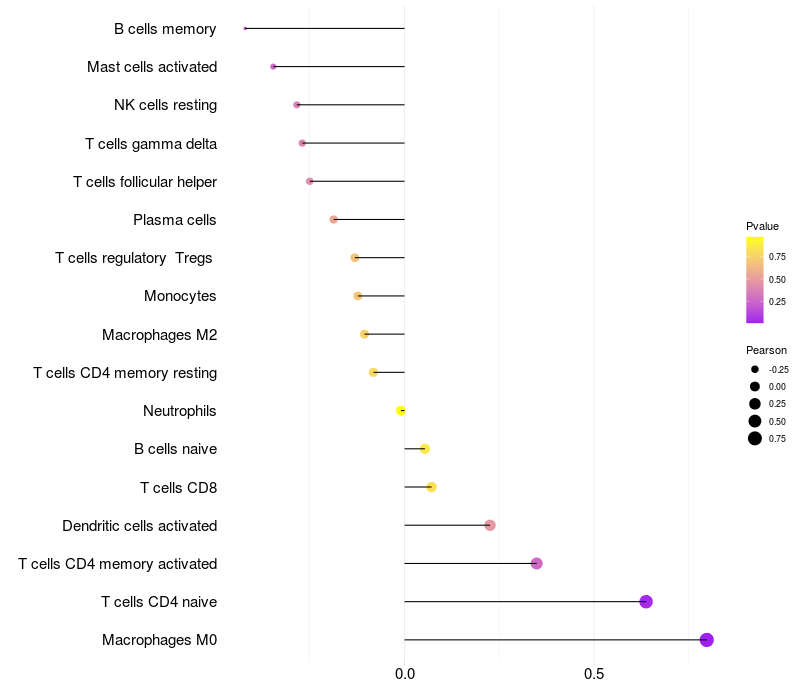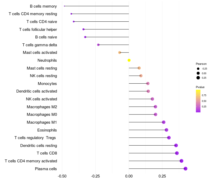 Lollipop of MIS18A expression and immune infiltrating cell level correlation result in EBV+ samples