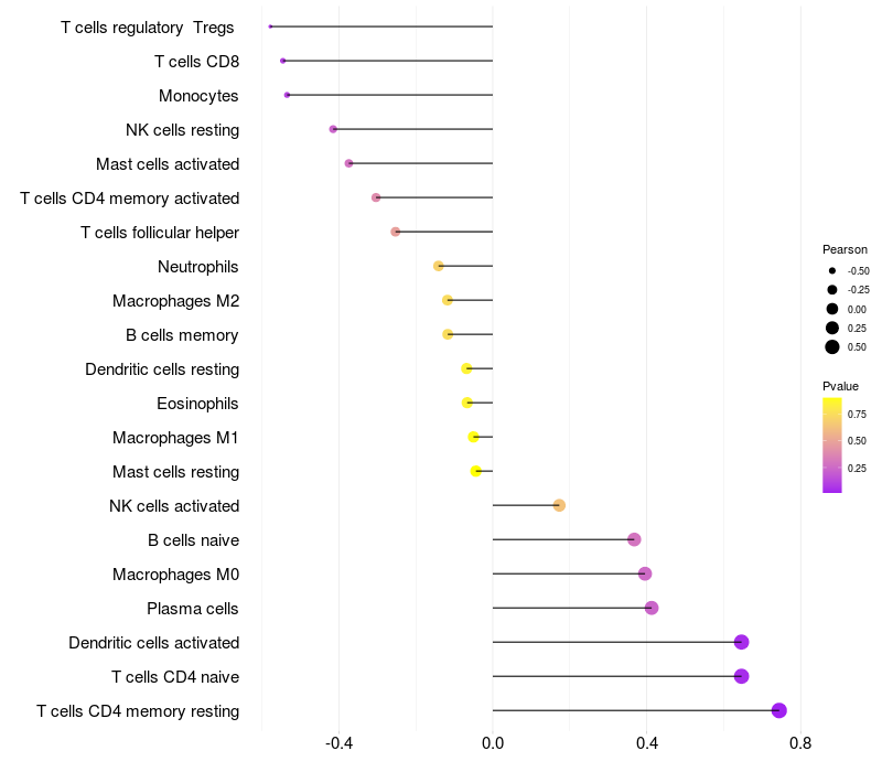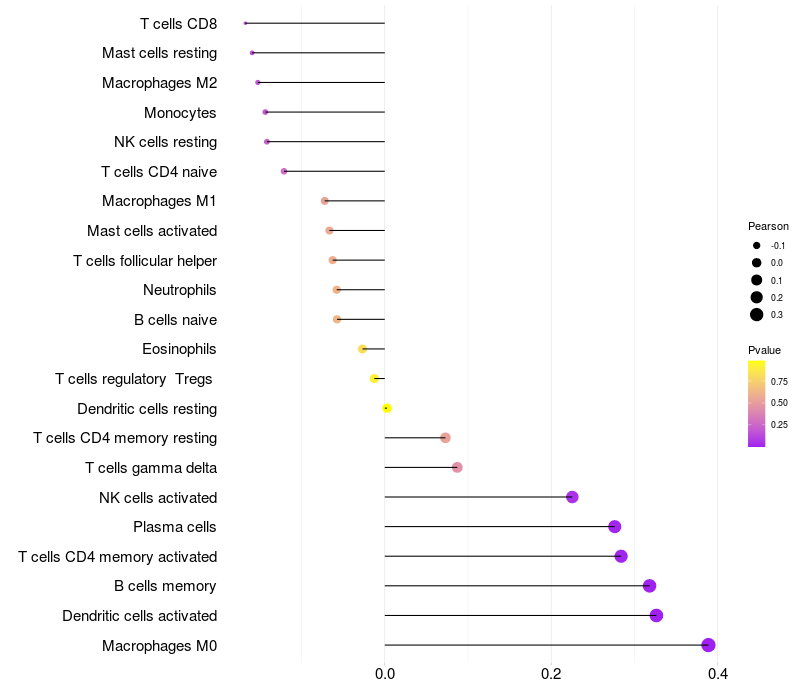 Lollipop of MITF expression and immune infiltrating cell level correlation result in HBV+ Chronic HBV (CHB) infection samples