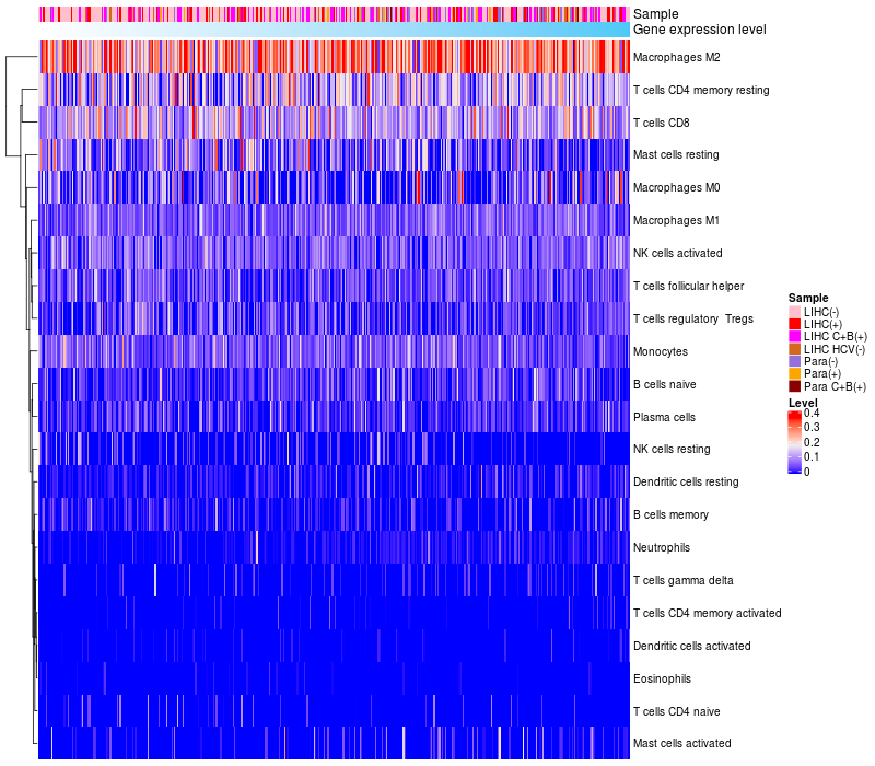 Liver hepatocellular carcinoma HCV (HBV+)(86), Liver hepatocellular carcinoma HCV (HBV-)(19), Liver hepatocellular carcinoma (HBV+)(209), Liver hepatocellular carcinoma (HBV+)(60), Paracancerous HCV (HBV+)(4), Paracancerous (HBV-)(28), Paracancerous (HBV+)(18) |