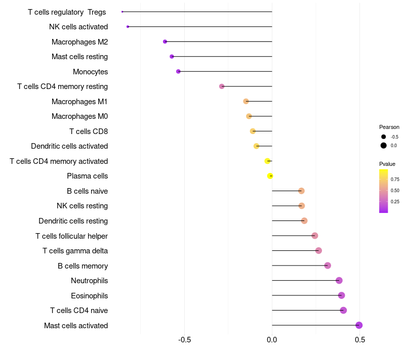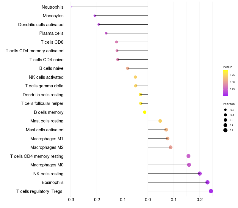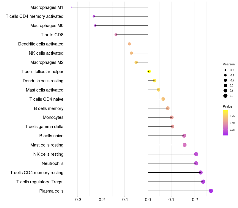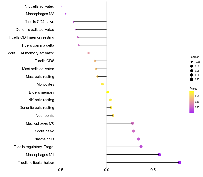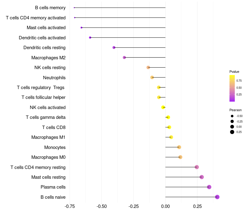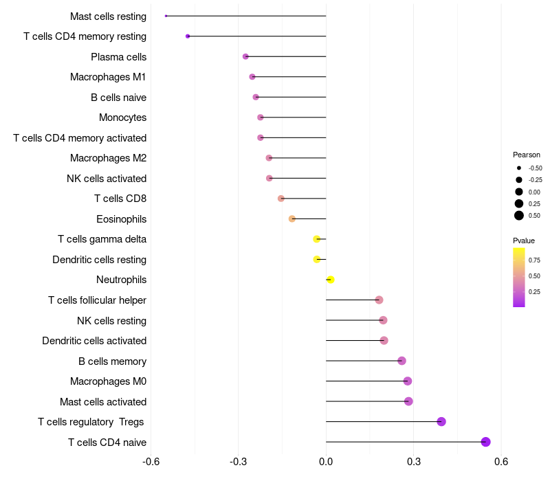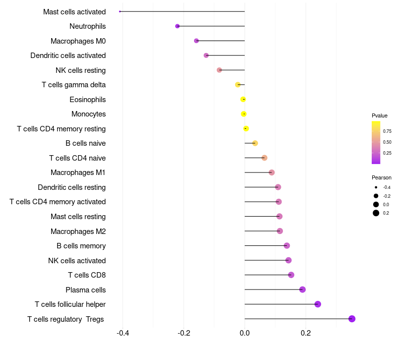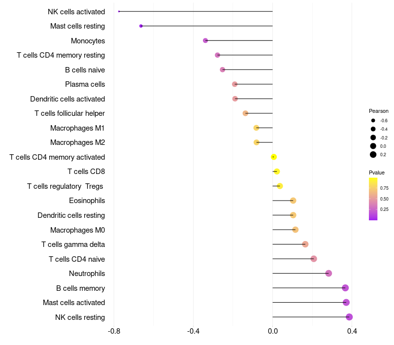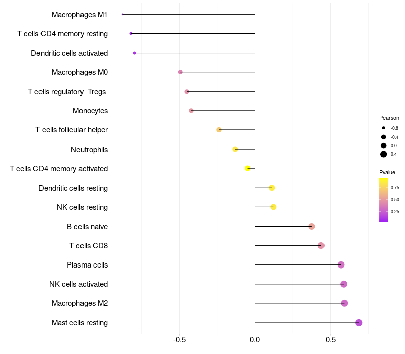 Lollipop of MKRN1 expression and immune infiltrating cell level correlation result in HPV+ samples