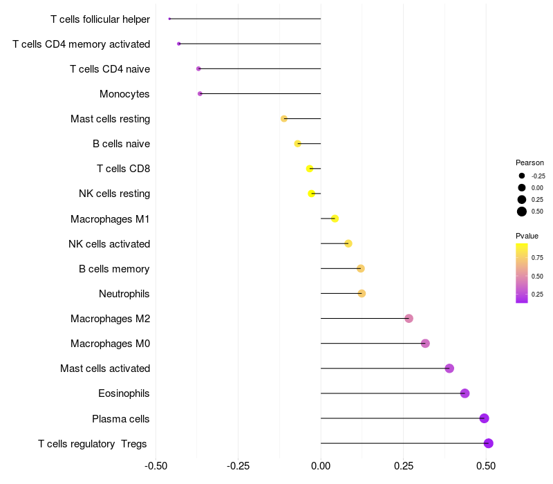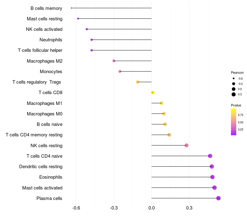 Lollipop of MLPH expression and immune infiltrating cell level correlation result in HBV+ Hepatocellular carcinoma samples