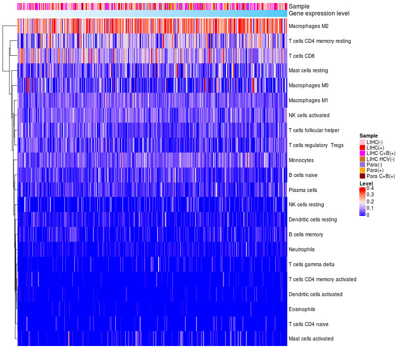 Liver hepatocellular carcinoma HCV (HBV+)(86), Liver hepatocellular carcinoma HCV (HBV-)(19), Liver hepatocellular carcinoma (HBV+)(209), Liver hepatocellular carcinoma (HBV+)(60), Paracancerous HCV (HBV+)(4), Paracancerous (HBV-)(28), Paracancerous (HBV+)(18) |