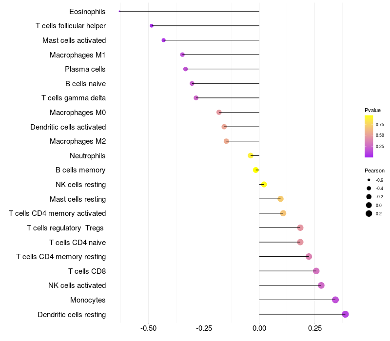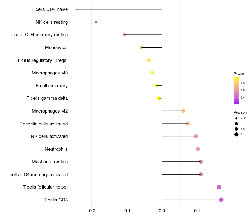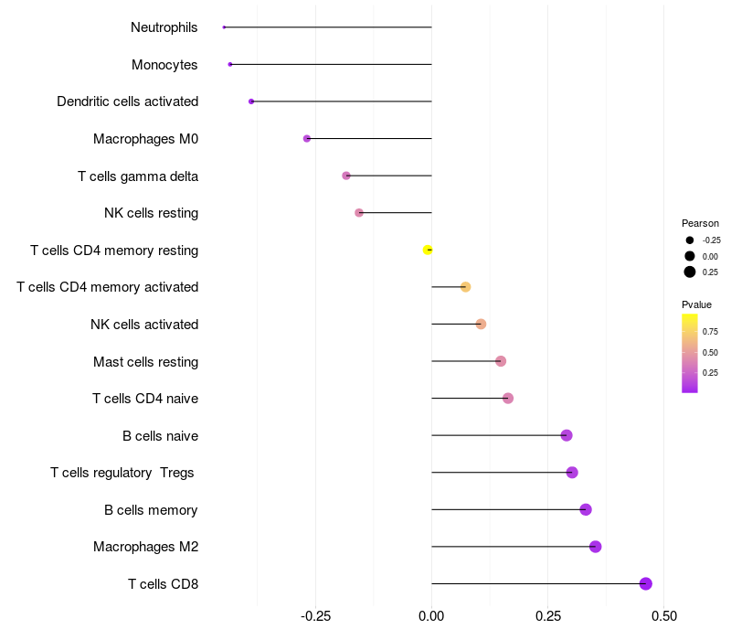 Lollipop of MMAA expression and immune infiltrating cell level correlation result in HTLV1+ samples