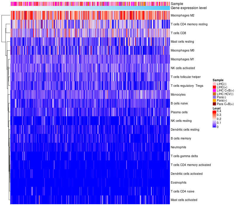 Liver hepatocellular carcinoma HCV (HBV+)(86), Liver hepatocellular carcinoma HCV (HBV-)(19), Liver hepatocellular carcinoma (HBV+)(209), Liver hepatocellular carcinoma (HBV+)(60), Paracancerous HCV (HBV+)(4), Paracancerous (HBV-)(28), Paracancerous (HBV+)(18) |