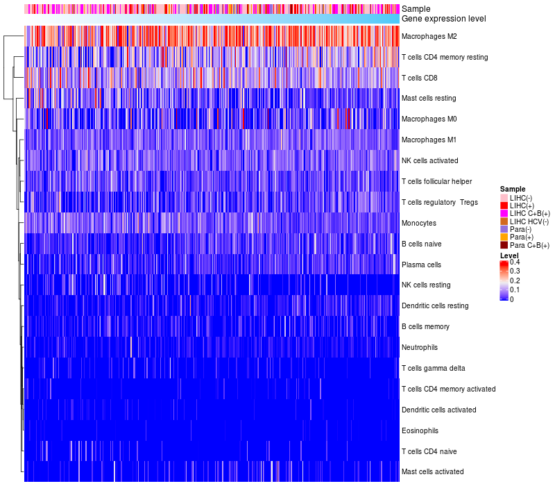 Liver hepatocellular carcinoma HCV (HBV+)(86), Liver hepatocellular carcinoma HCV (HBV-)(19), Liver hepatocellular carcinoma (HBV+)(209), Liver hepatocellular carcinoma (HBV+)(60), Paracancerous HCV (HBV+)(4), Paracancerous (HBV-)(28), Paracancerous (HBV+)(18) |