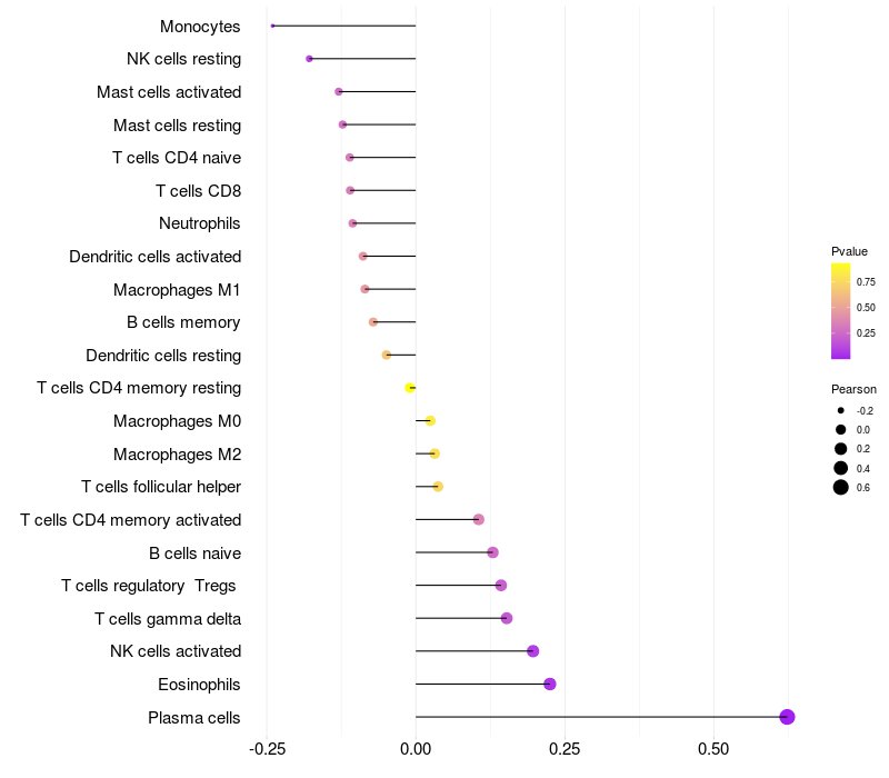 Lollipop of MMP2 expression and immune infiltrating cell level correlation result in HBV+ samples
