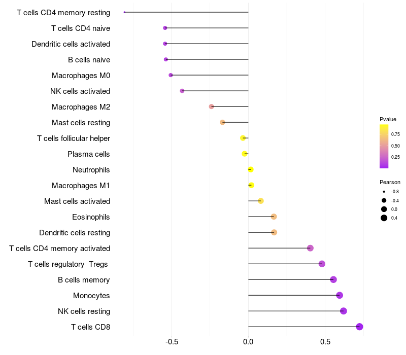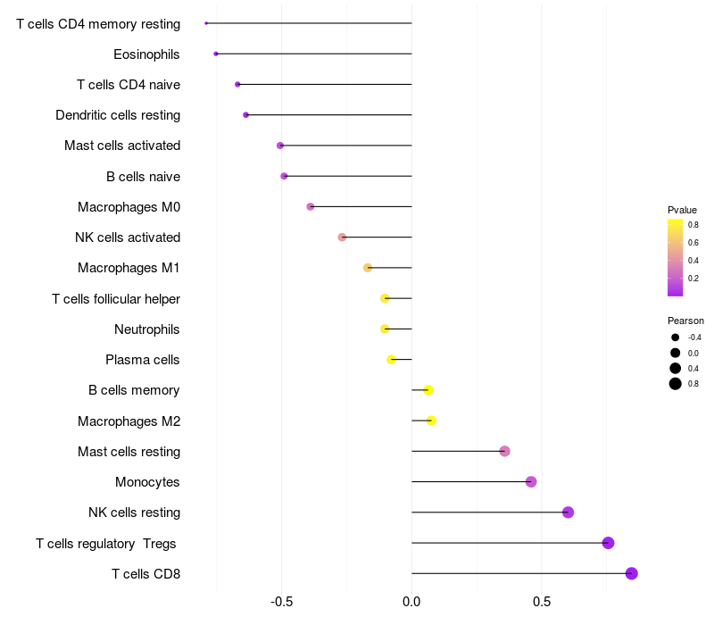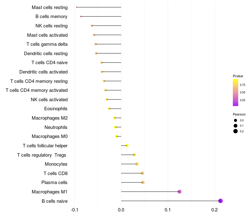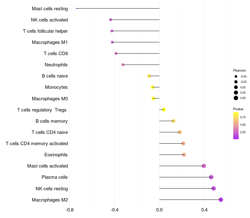 Lollipop of MMP26 expression and immune infiltrating cell level correlation result in HBV+ Liver cirrhosis samples