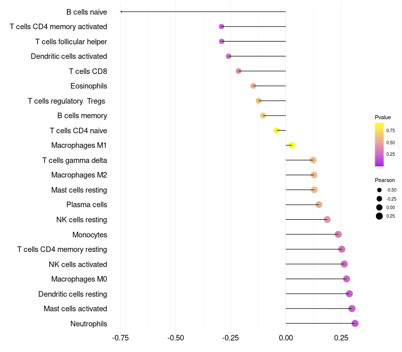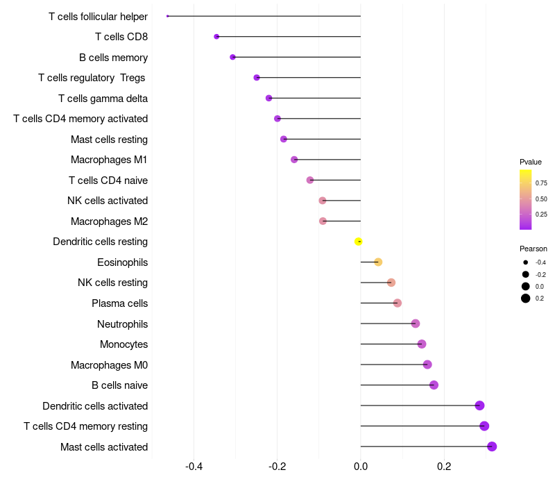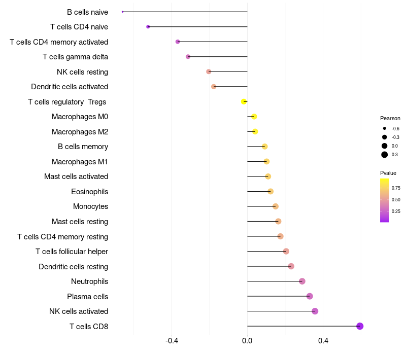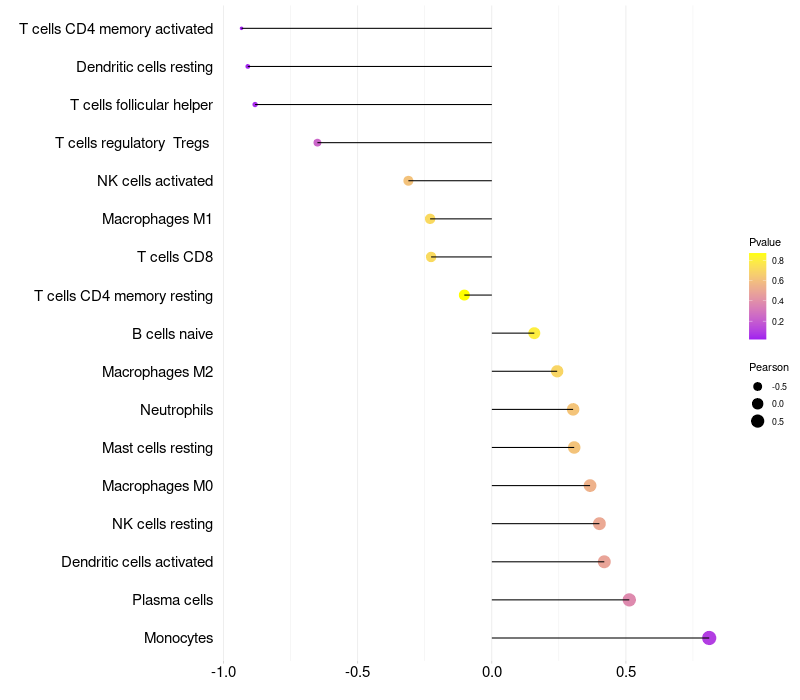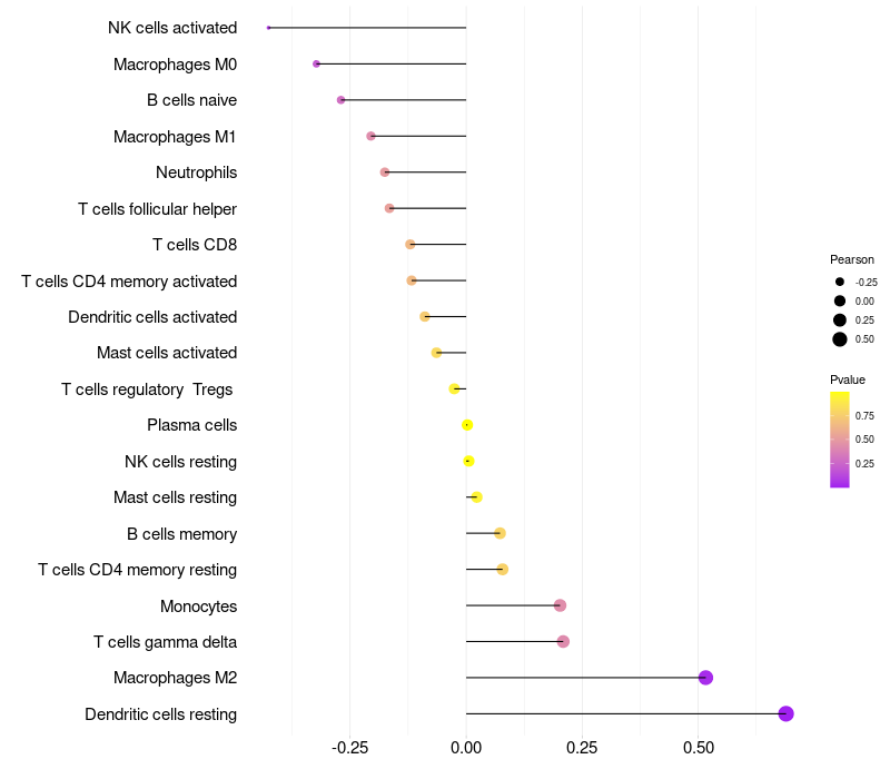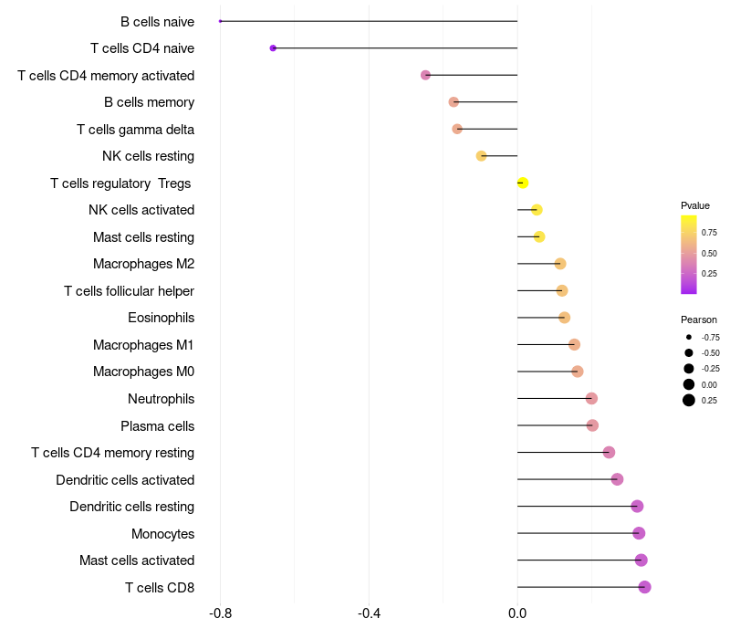 Lollipop of MN1 expression and immune infiltrating cell level correlation result in HPV+ samples