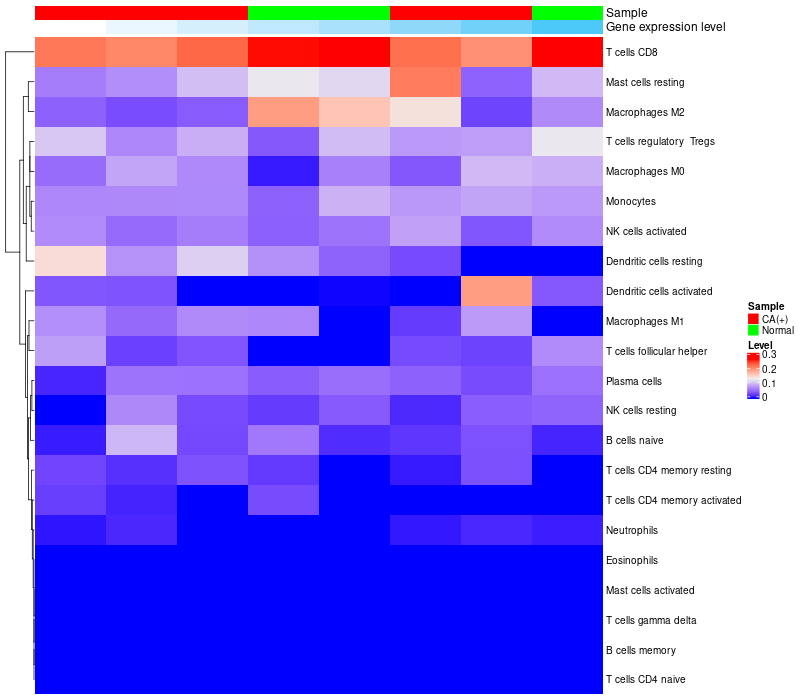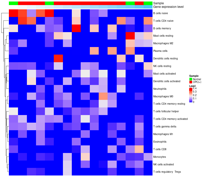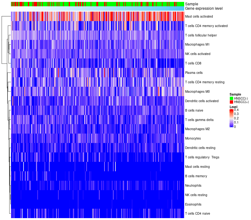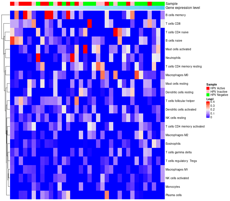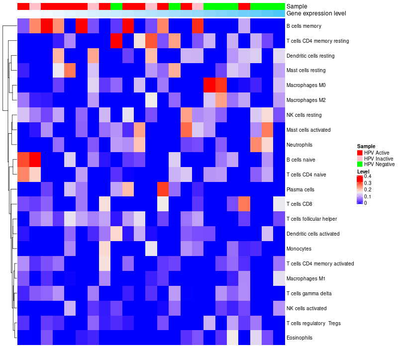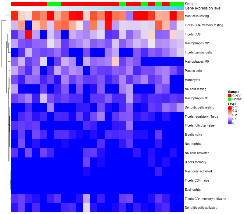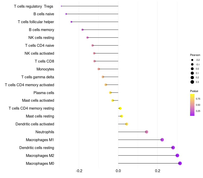 Lollipop of MN1 expression and immune infiltrating cell level correlation result in HPV+ samples
