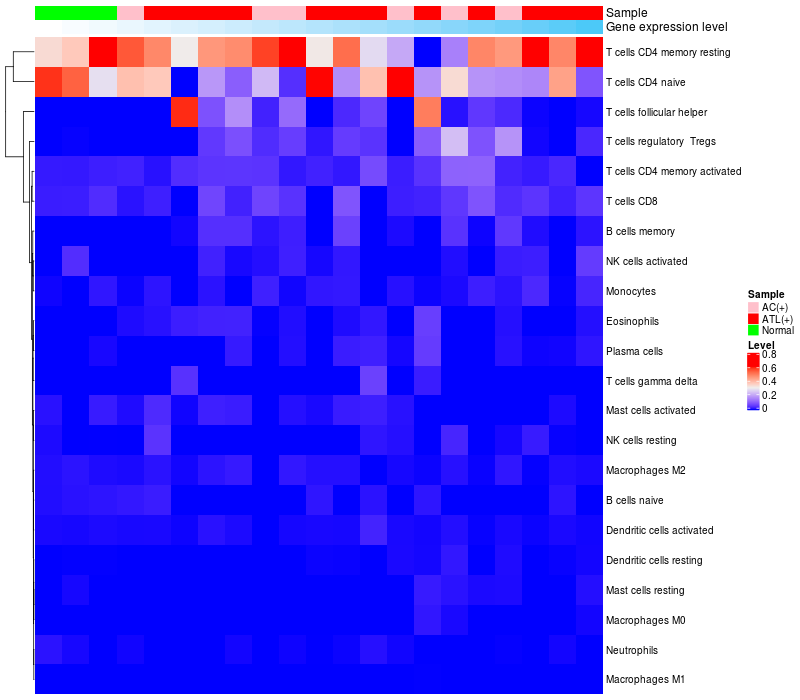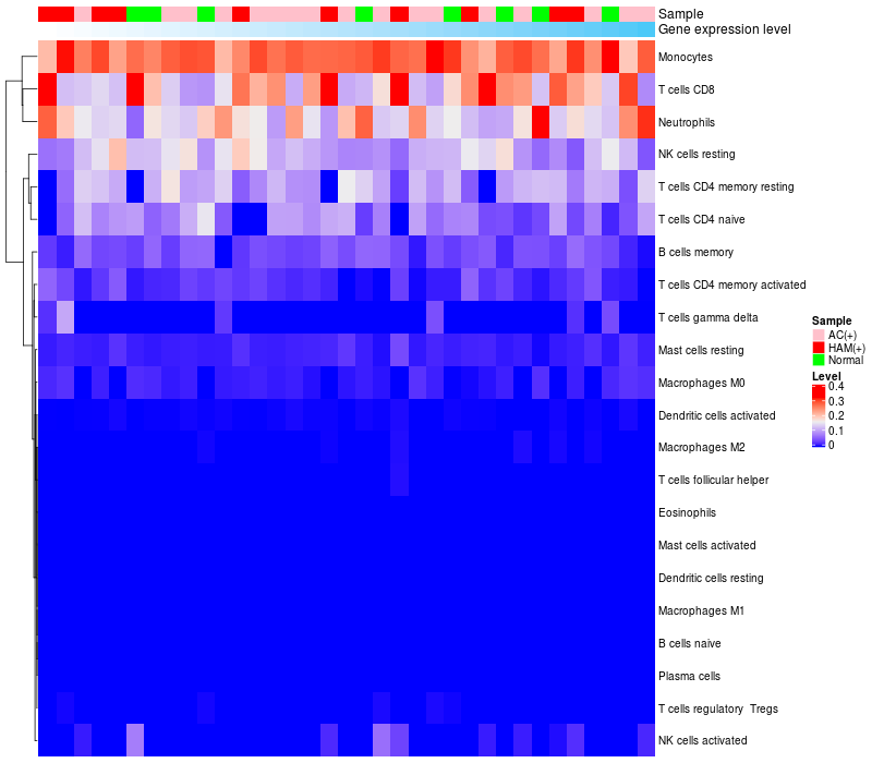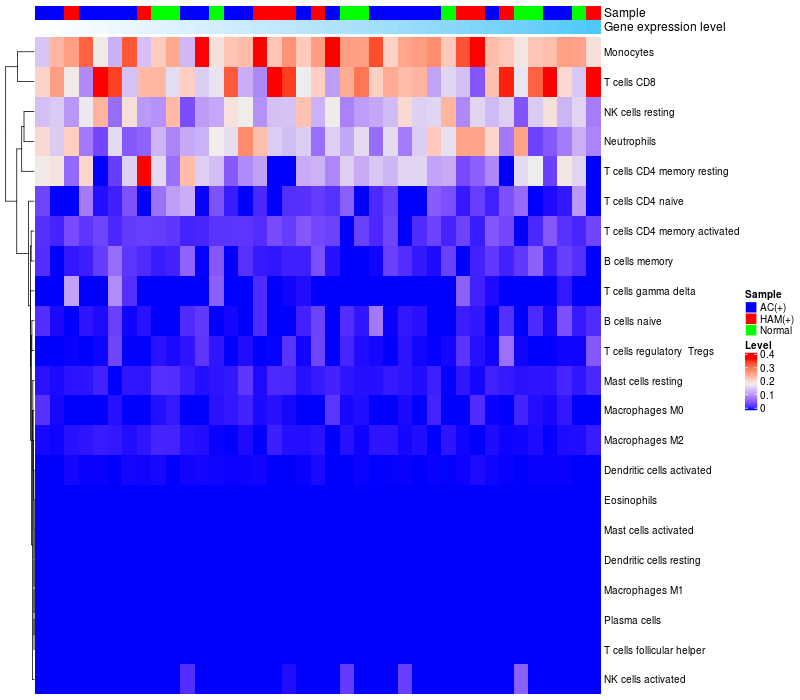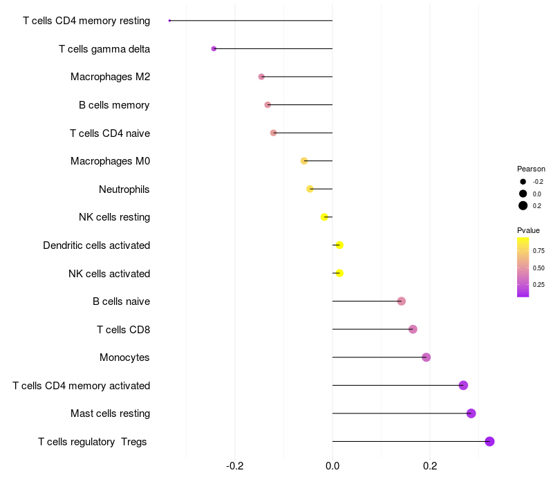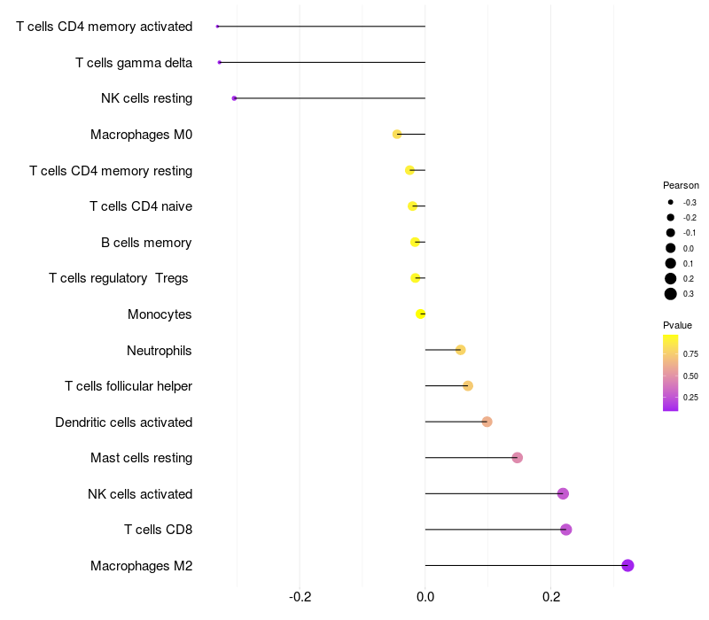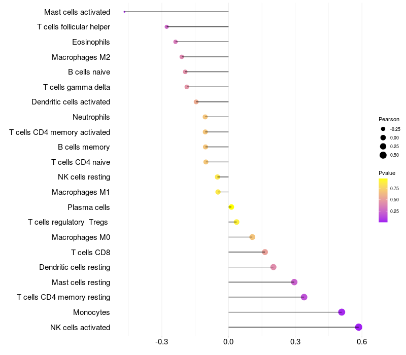 Lollipop of MON1B expression and immune infiltrating cell level correlation result in HTLV1+ samples