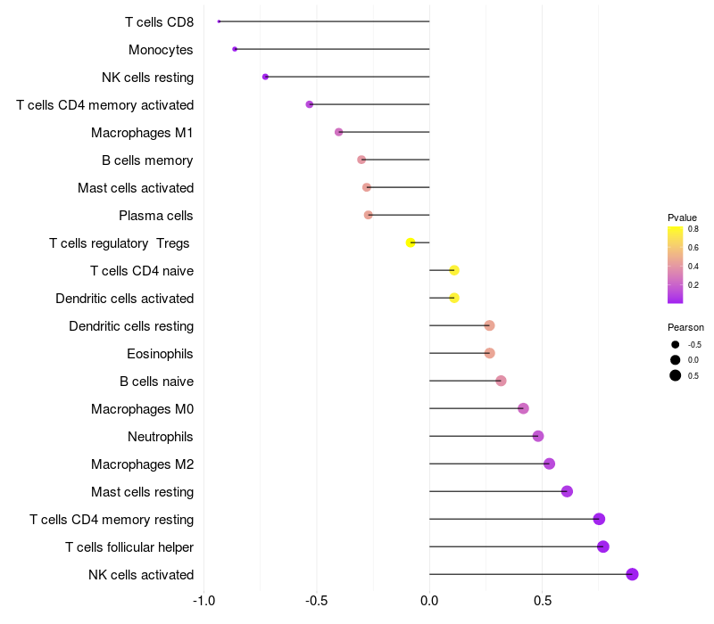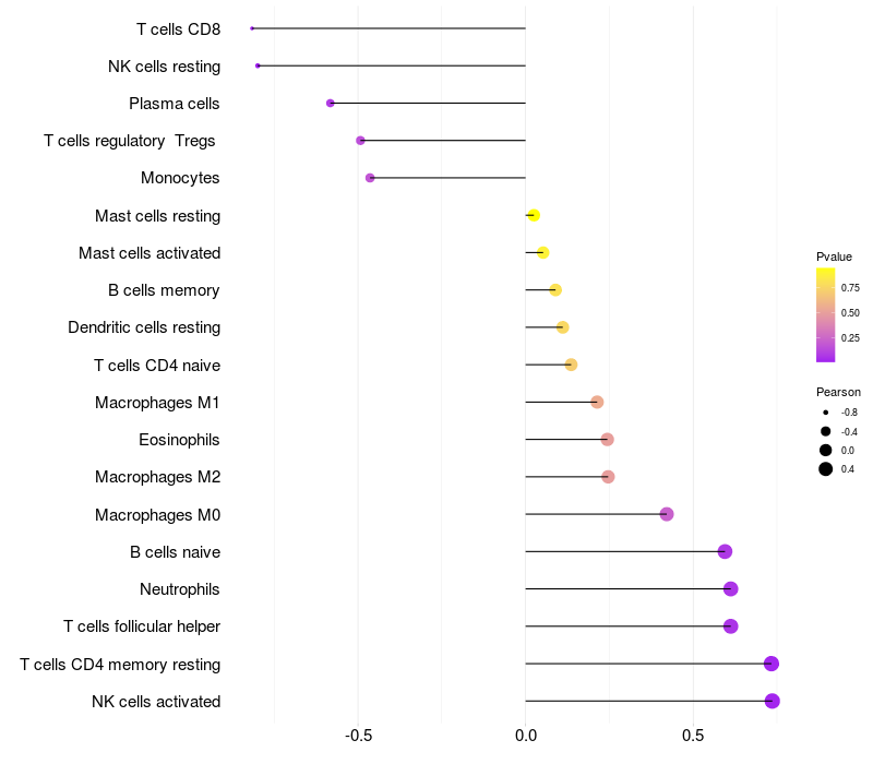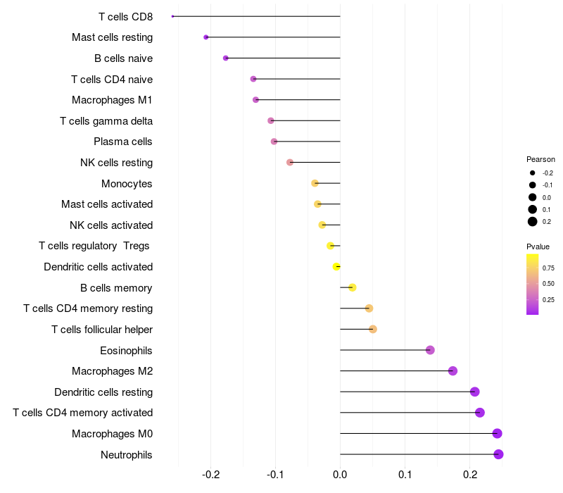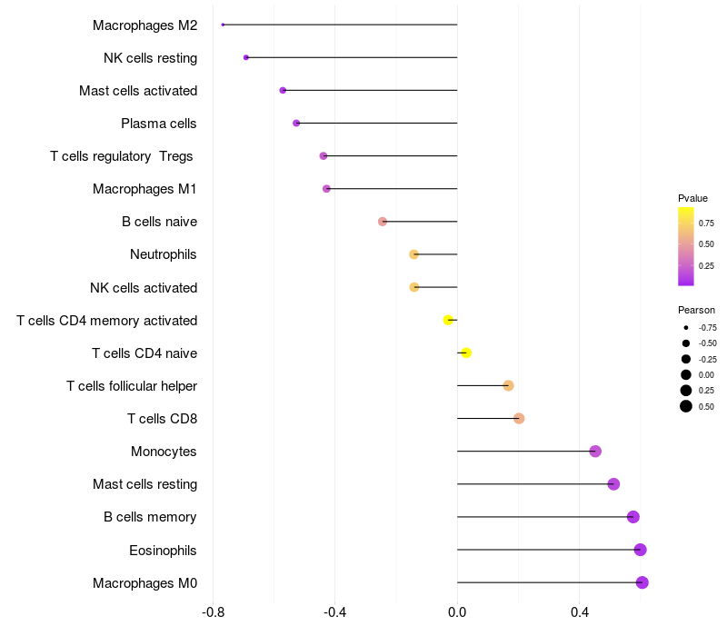 Lollipop of MORF4L2 expression and immune infiltrating cell level correlation result in HBV+ Liver cirrhosis samples