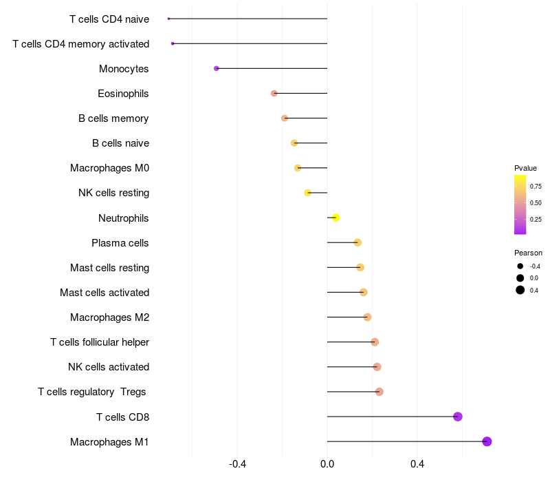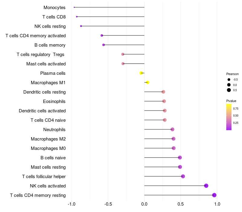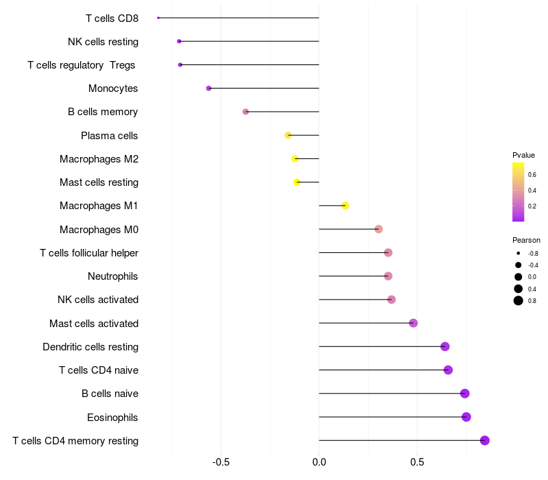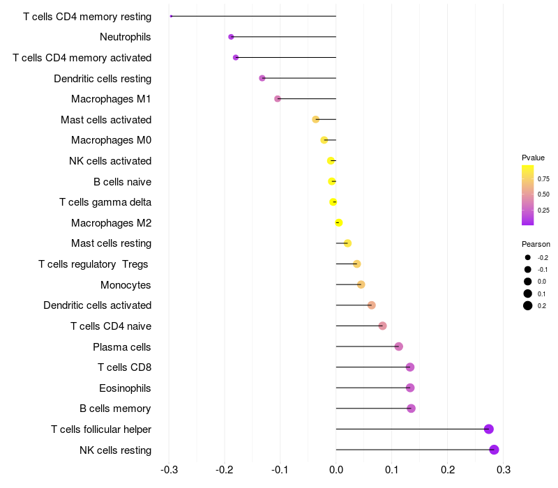 Lollipop of MPG expression and immune infiltrating cell level correlation result in HBV+ Liver cirrhosis samples