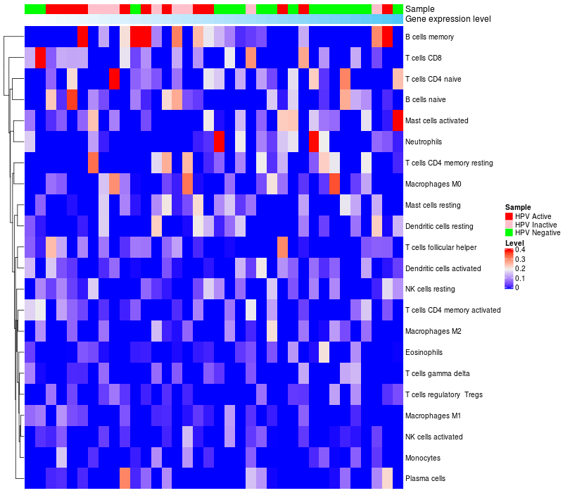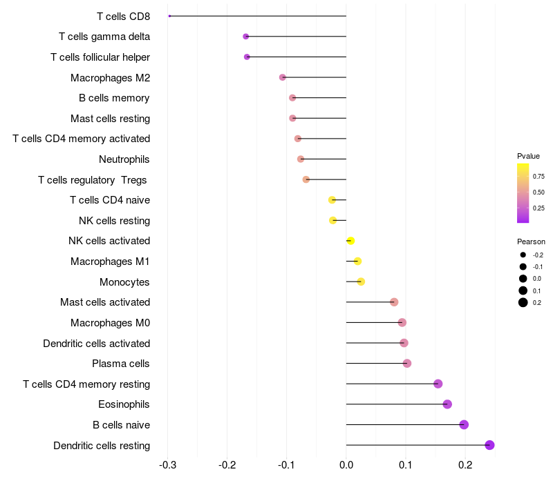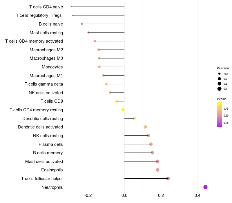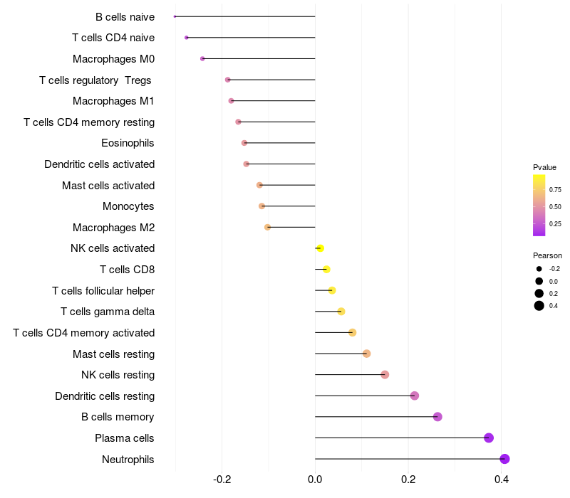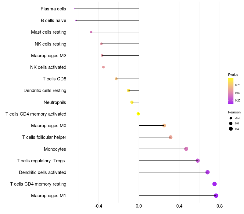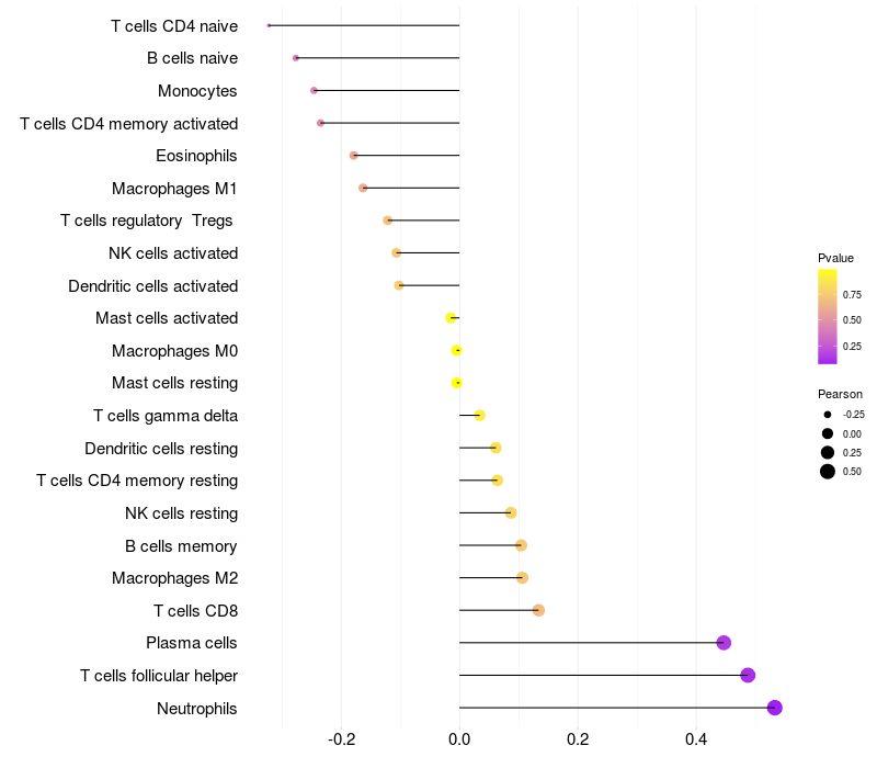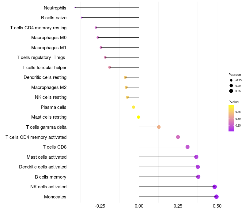 Lollipop of MPP4 expression and immune infiltrating cell level correlation result in HPV+ samples