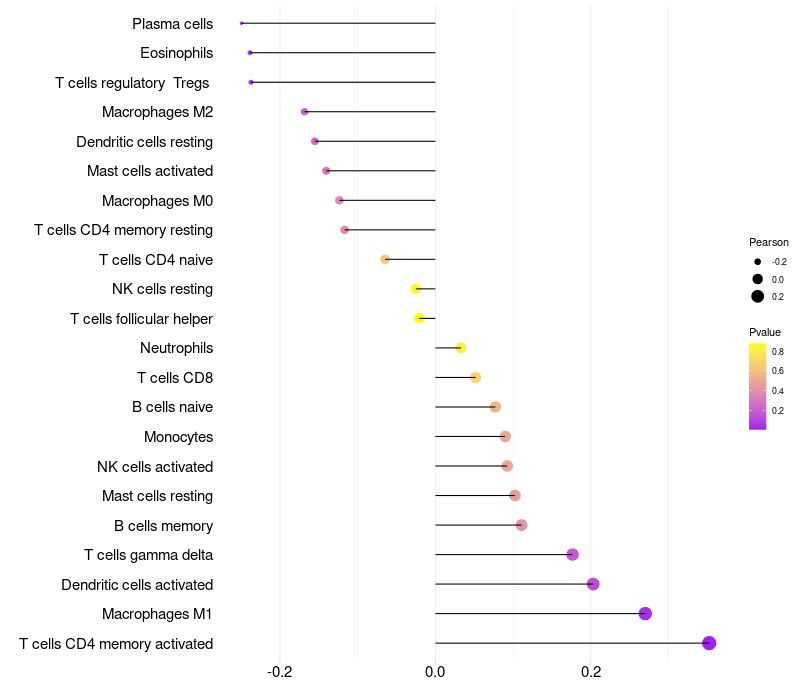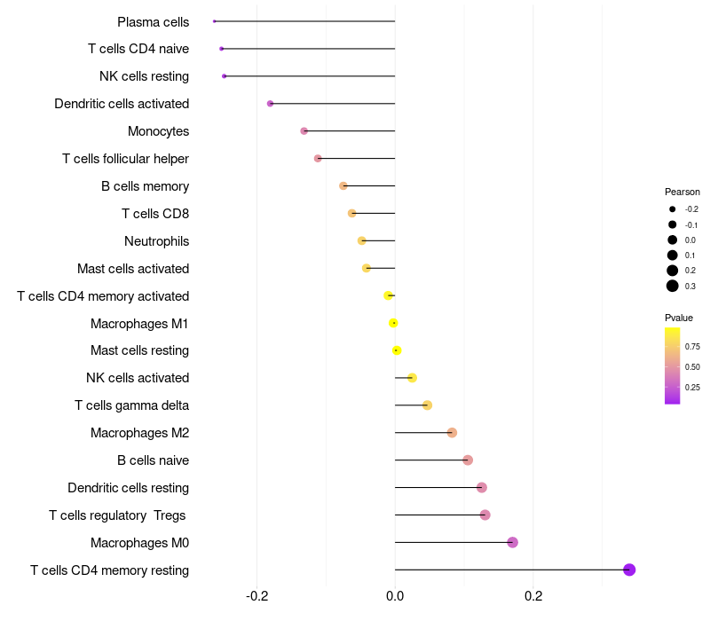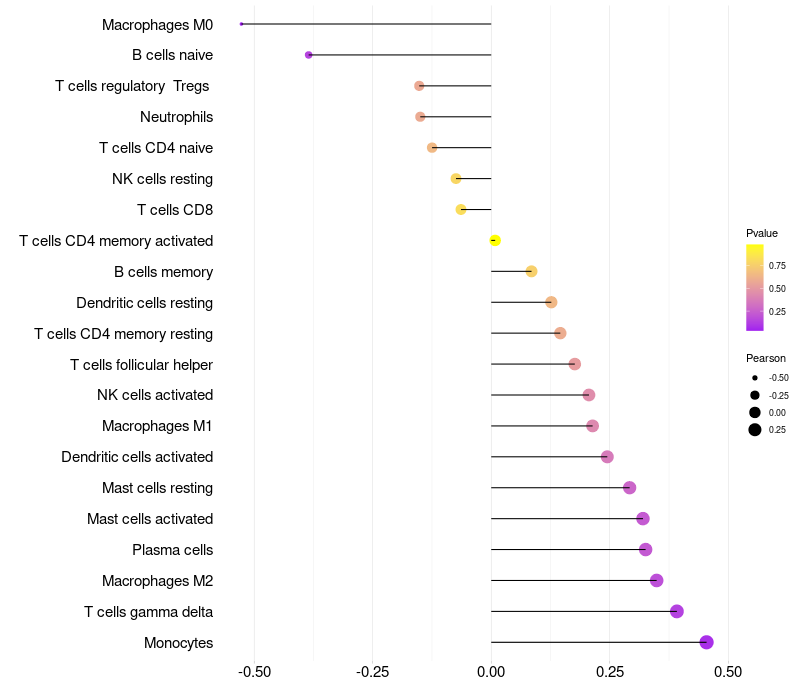 Lollipop of MPZL1 expression and immune infiltrating cell level correlation result in HPV+ samples
