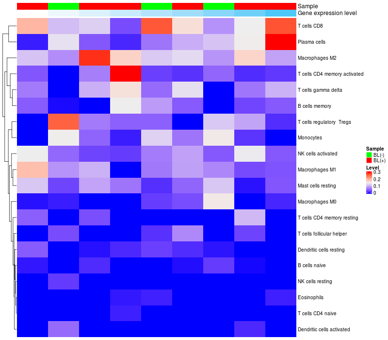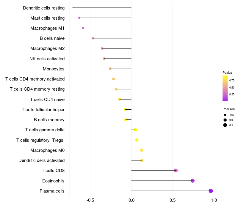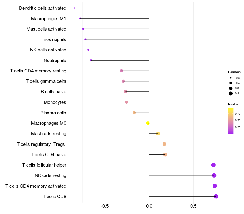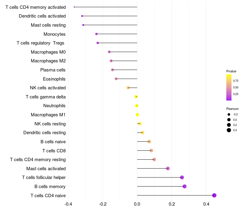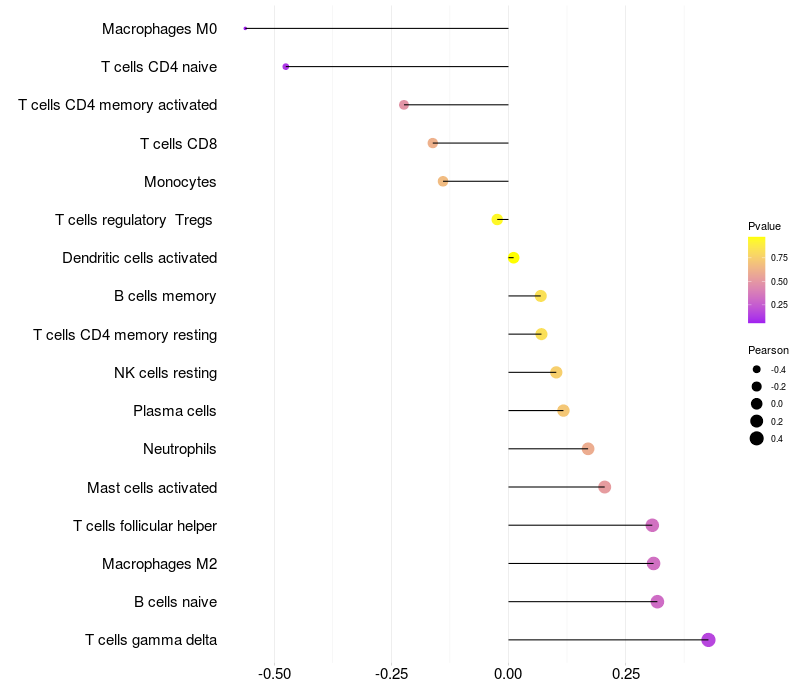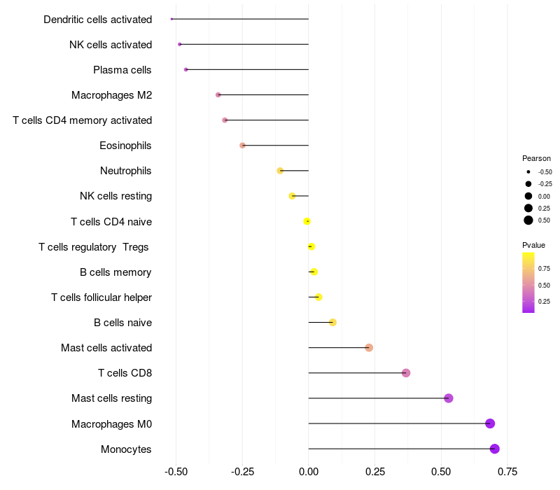 Lollipop of MROH8 expression and immune infiltrating cell level correlation result in EBV+ samples