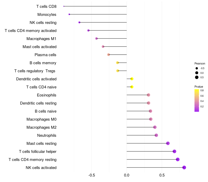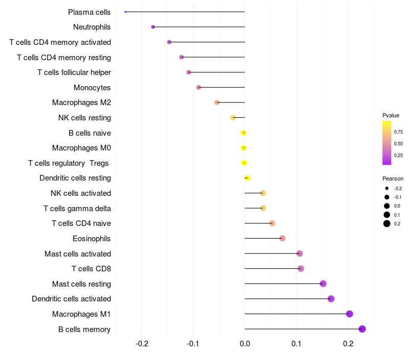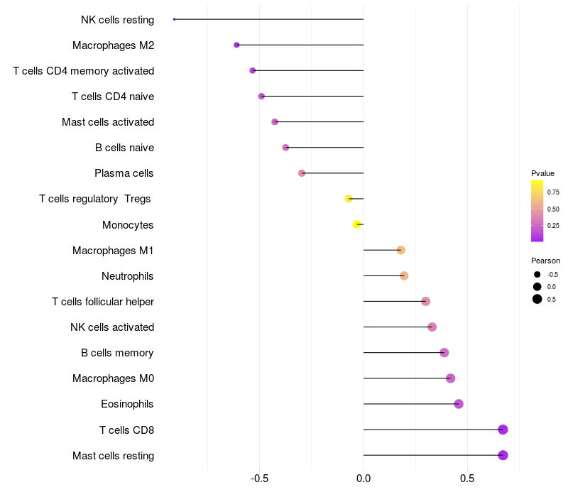 Lollipop of MRPL1 expression and immune infiltrating cell level correlation result in HBV+ Liver cirrhosis samples