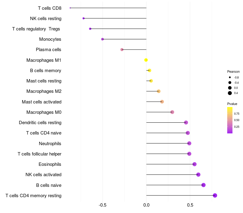 Lollipop of MRPL1 expression and immune infiltrating cell level correlation result in HBV+ samples