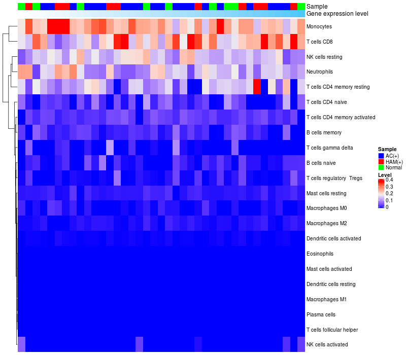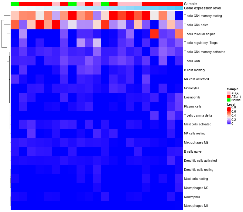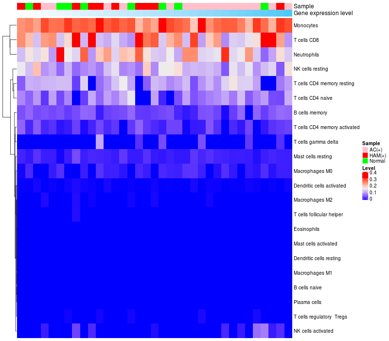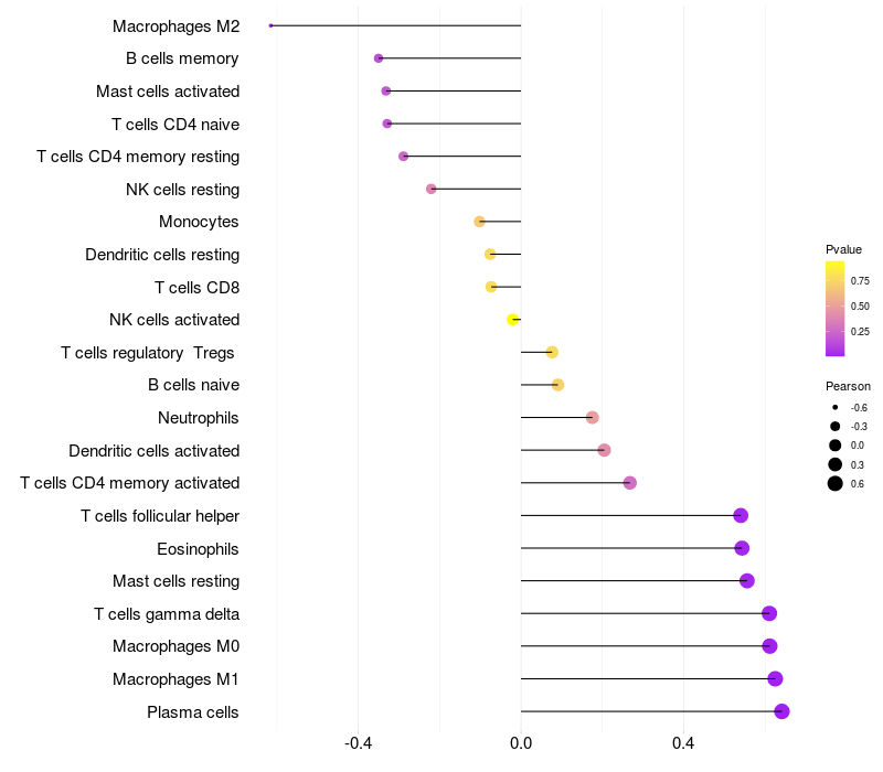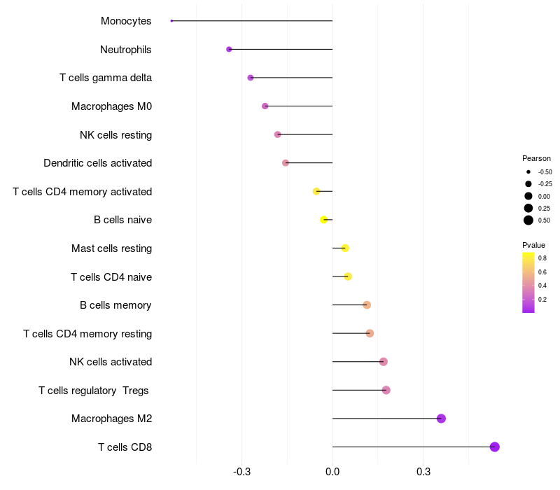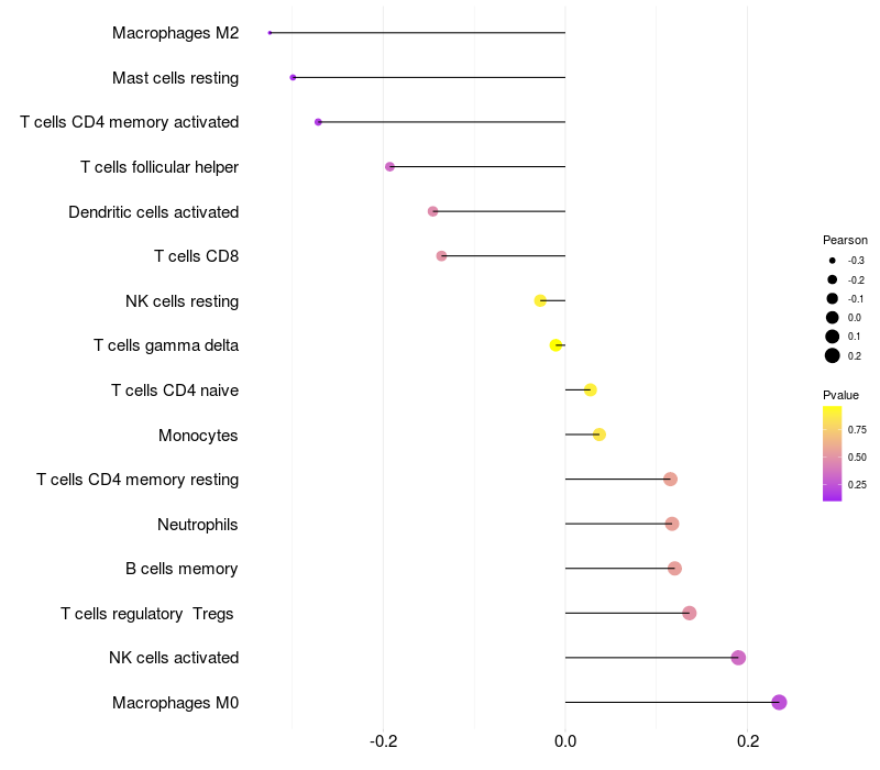 Lollipop of MRPS14 expression and immune infiltrating cell level correlation result in HTLV1+ samples