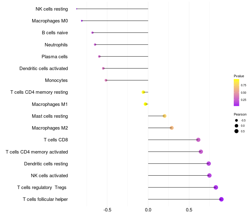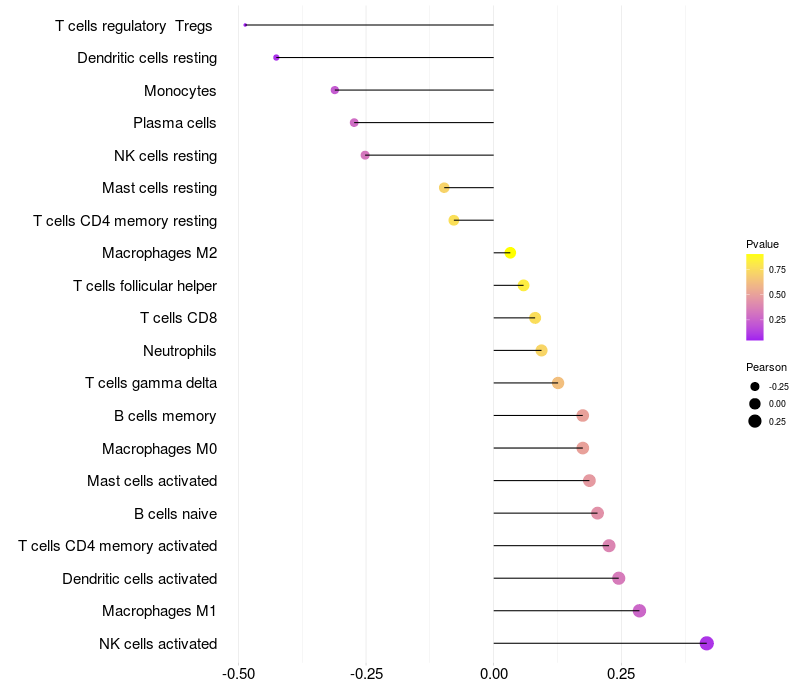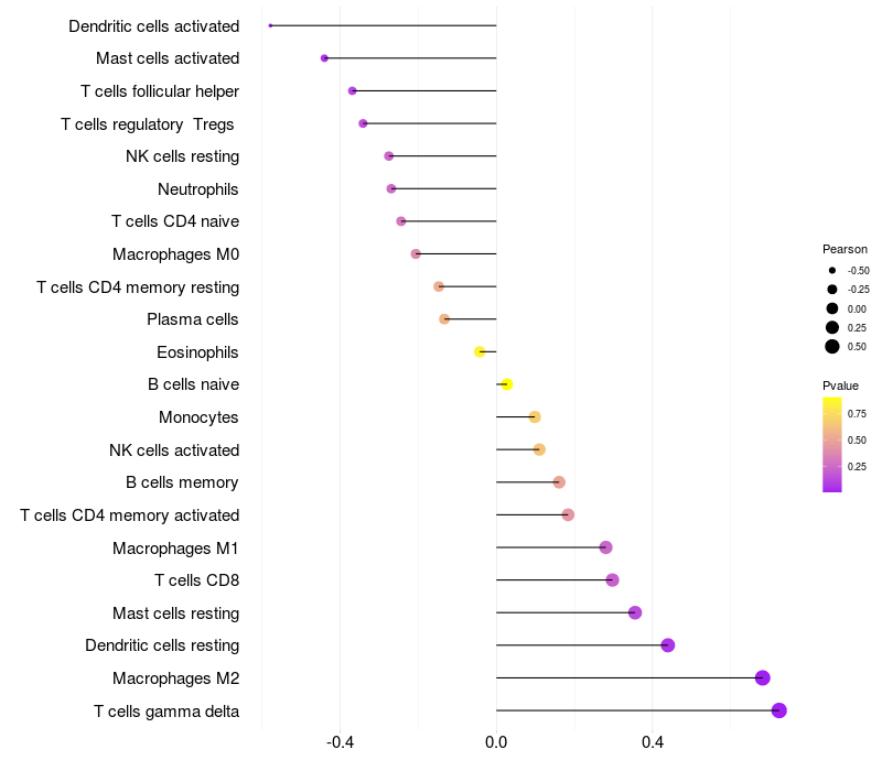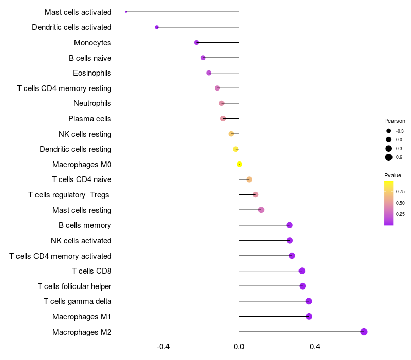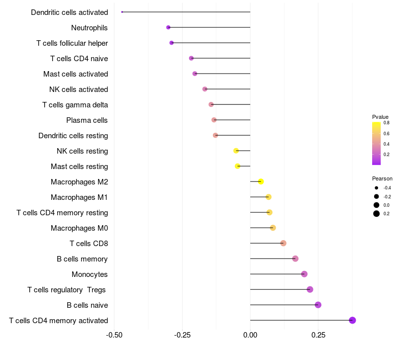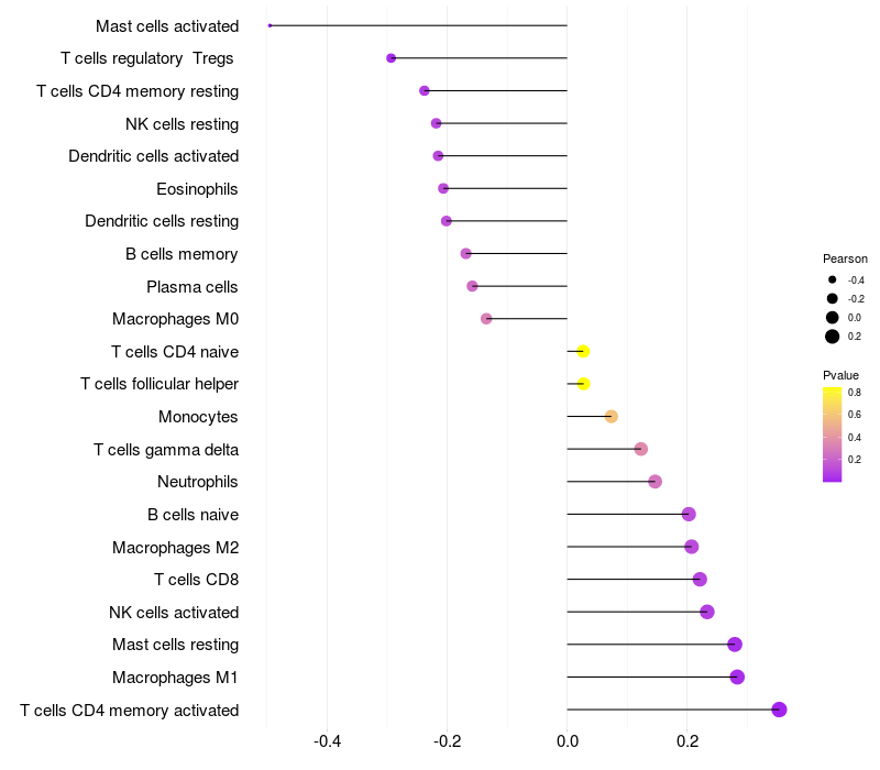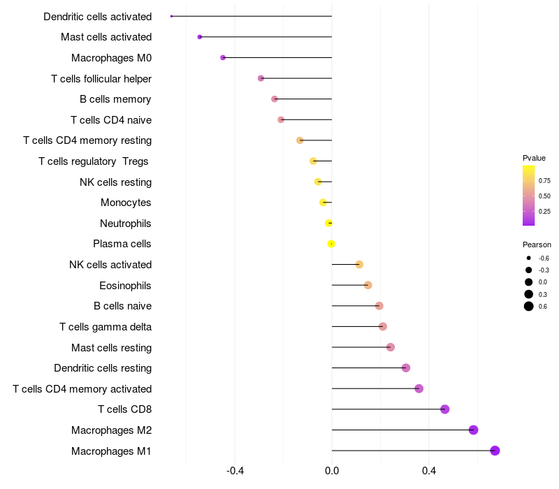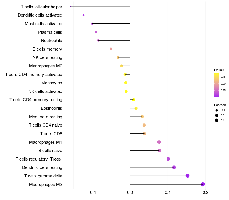 Lollipop of MS4A6A expression and immune infiltrating cell level correlation result in HPV+ samples