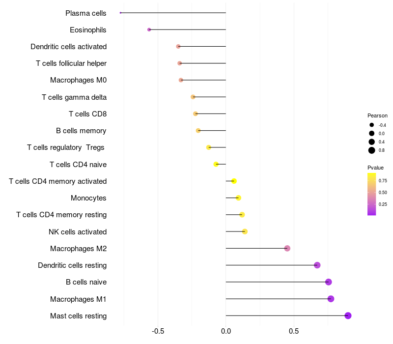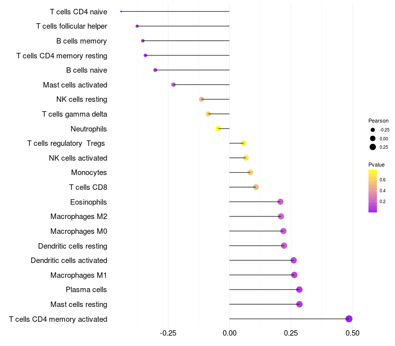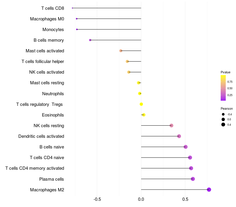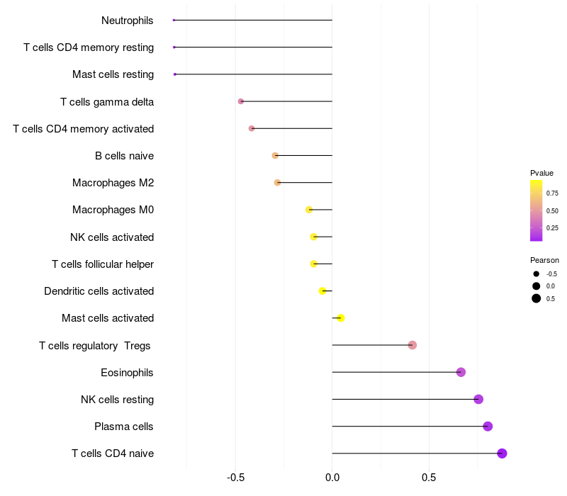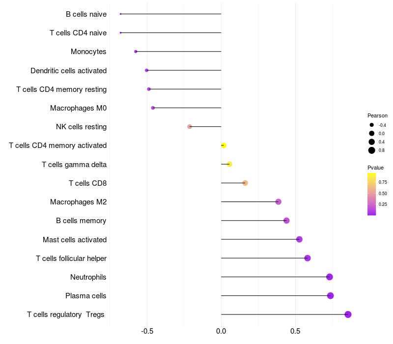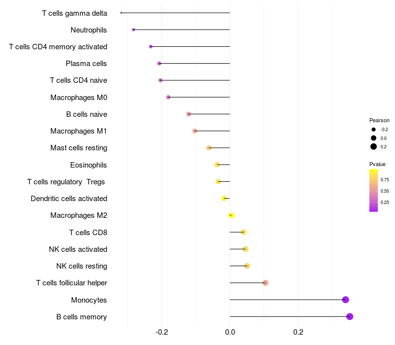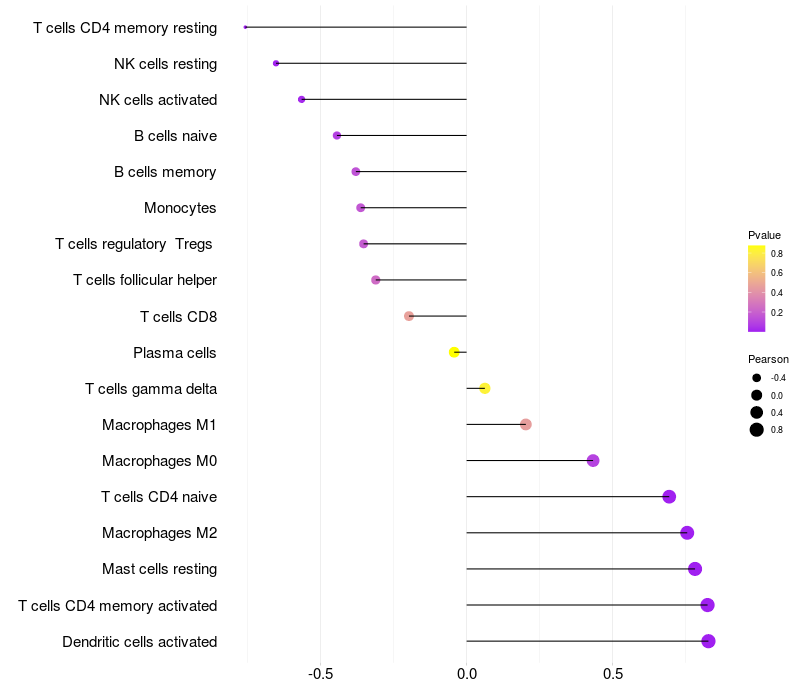 Lollipop of MSH2 expression and immune infiltrating cell level correlation result in EBV+ samples