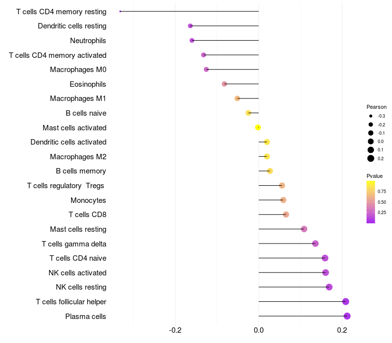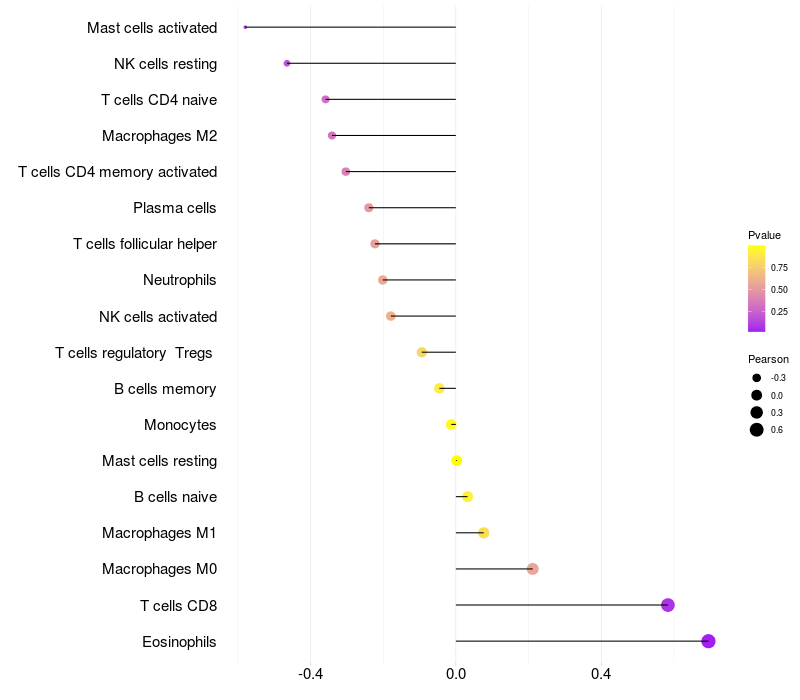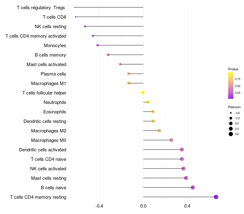 Lollipop of MSRB2 expression and immune infiltrating cell level correlation result in HBV+ Liver cirrhosis samples