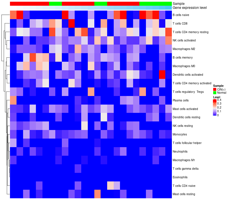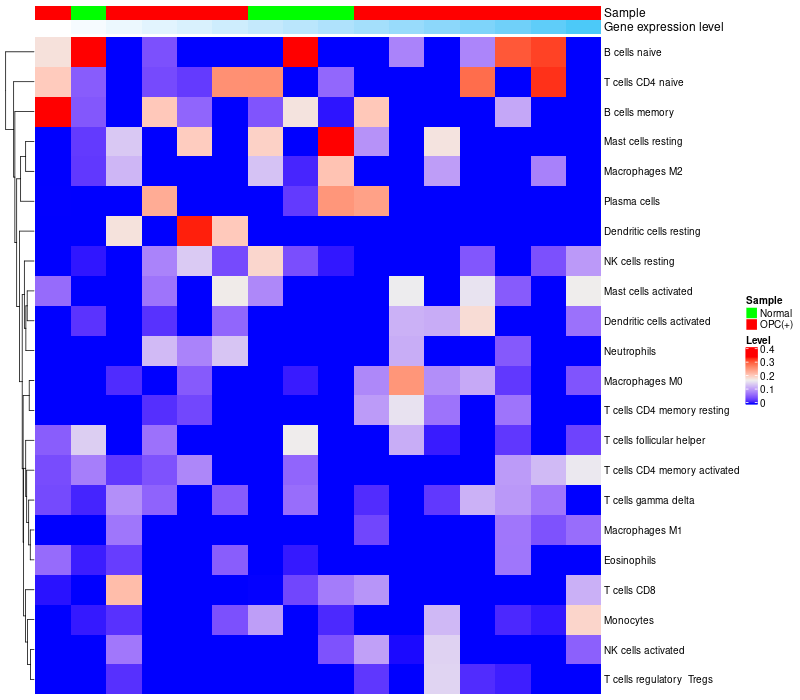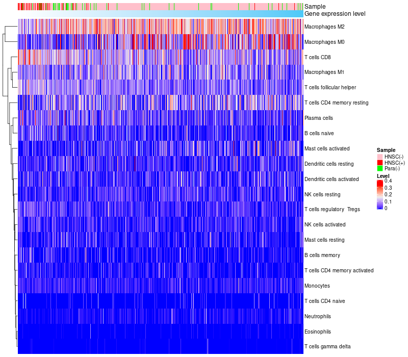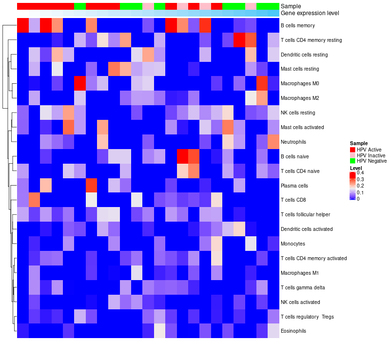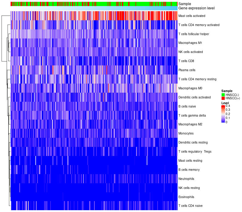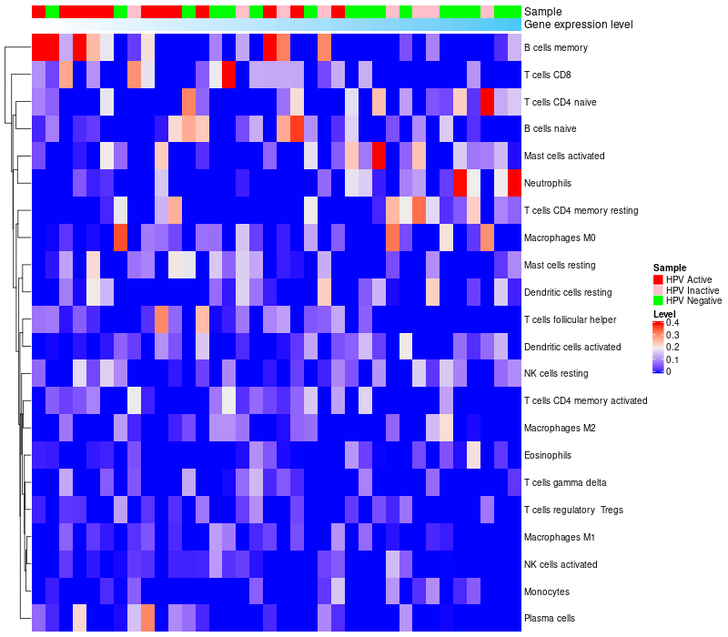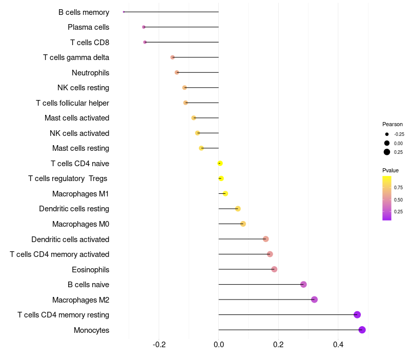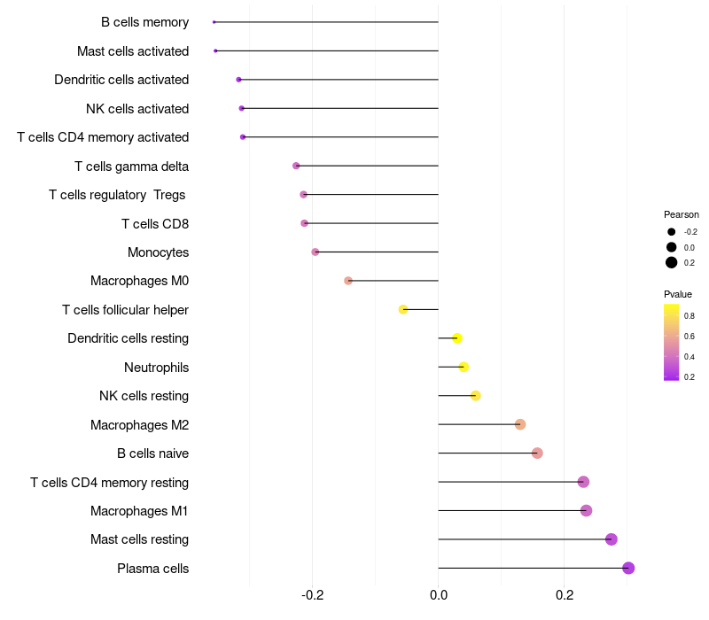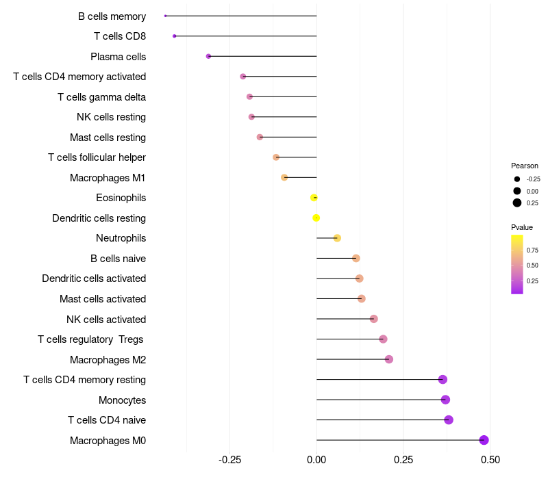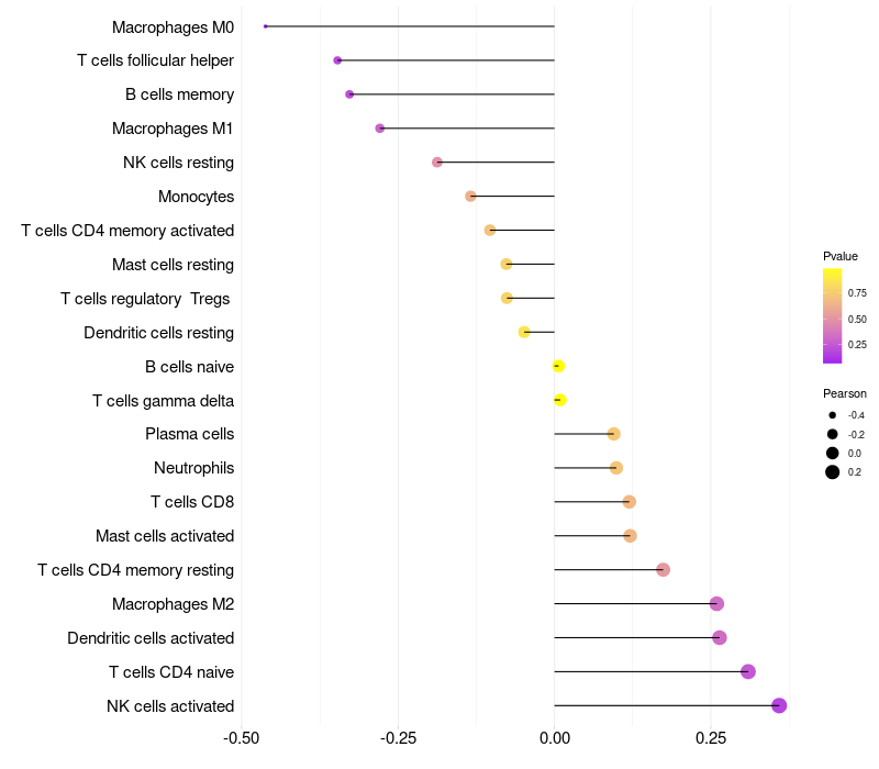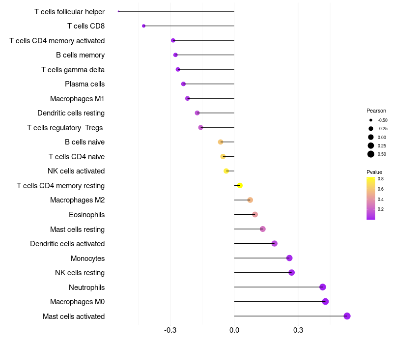 Lollipop of MSX2 expression and immune infiltrating cell level correlation result in HPV+ samples