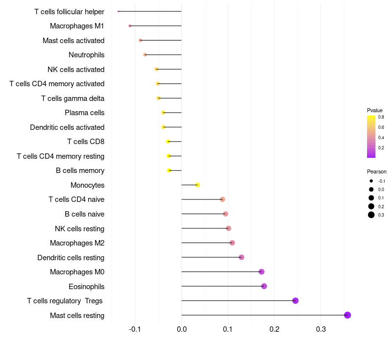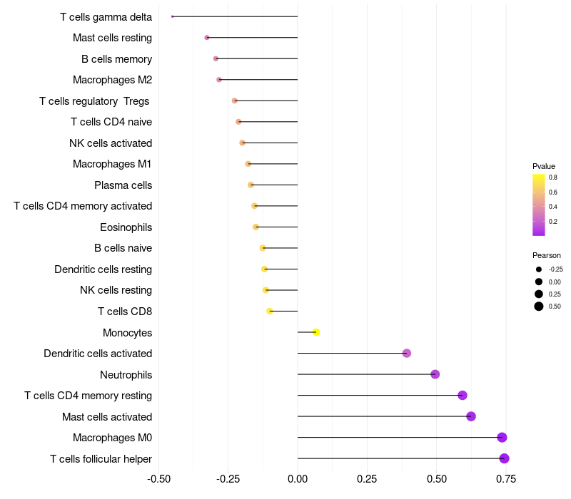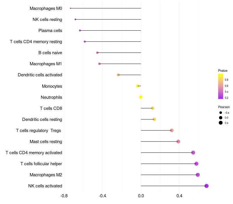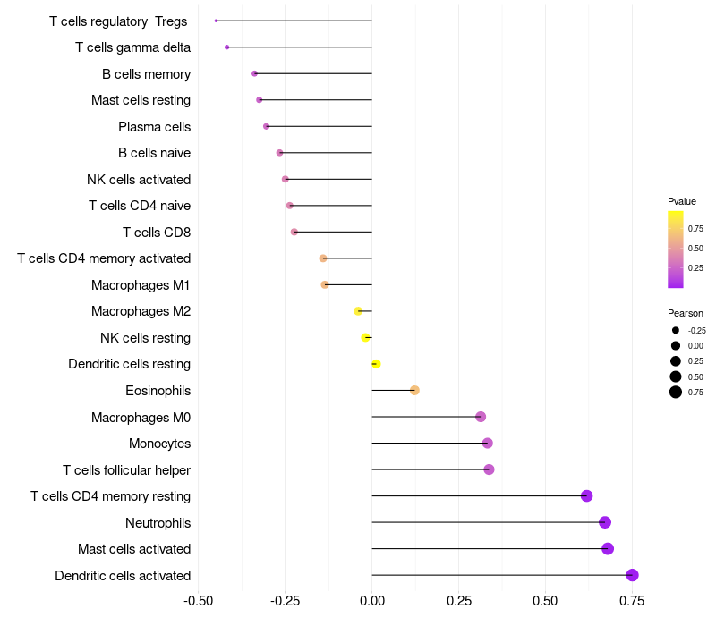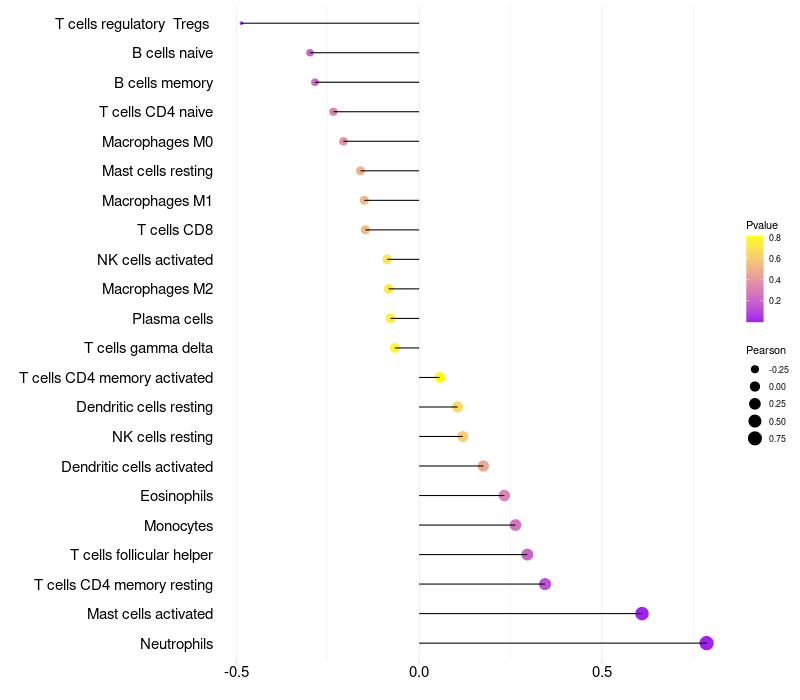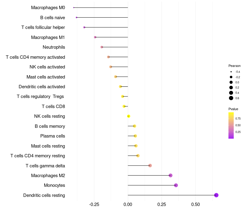 Lollipop of MT4 expression and immune infiltrating cell level correlation result in HPV+ samples