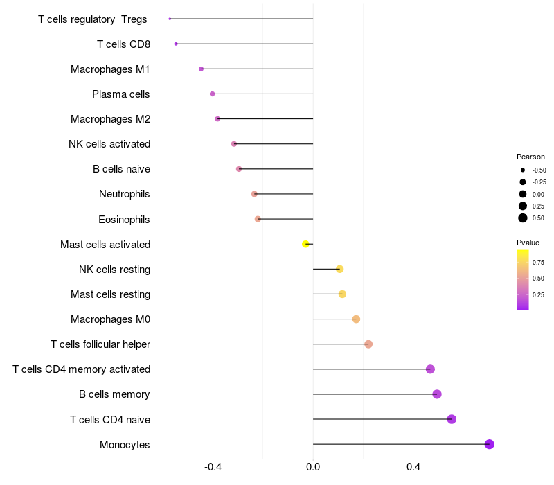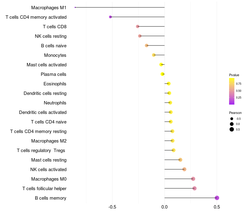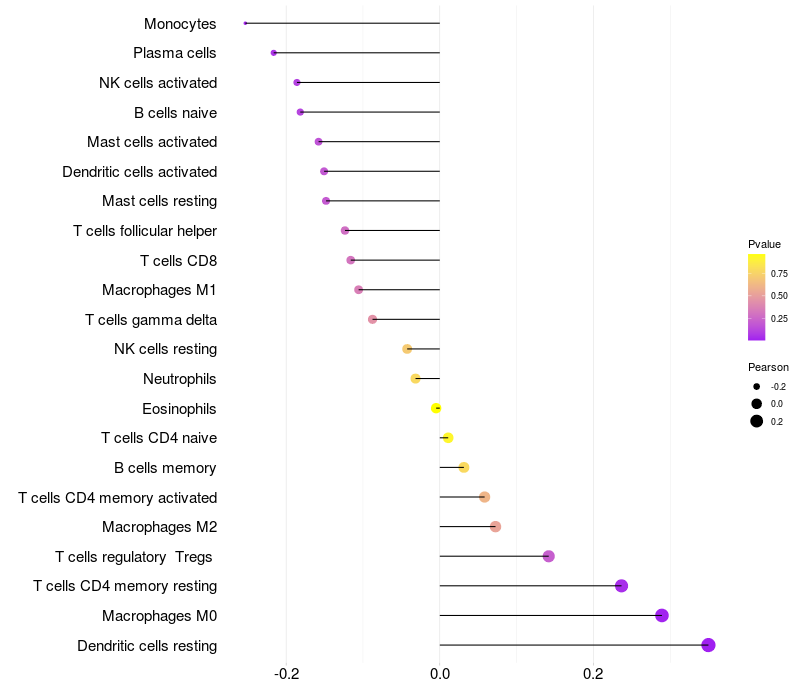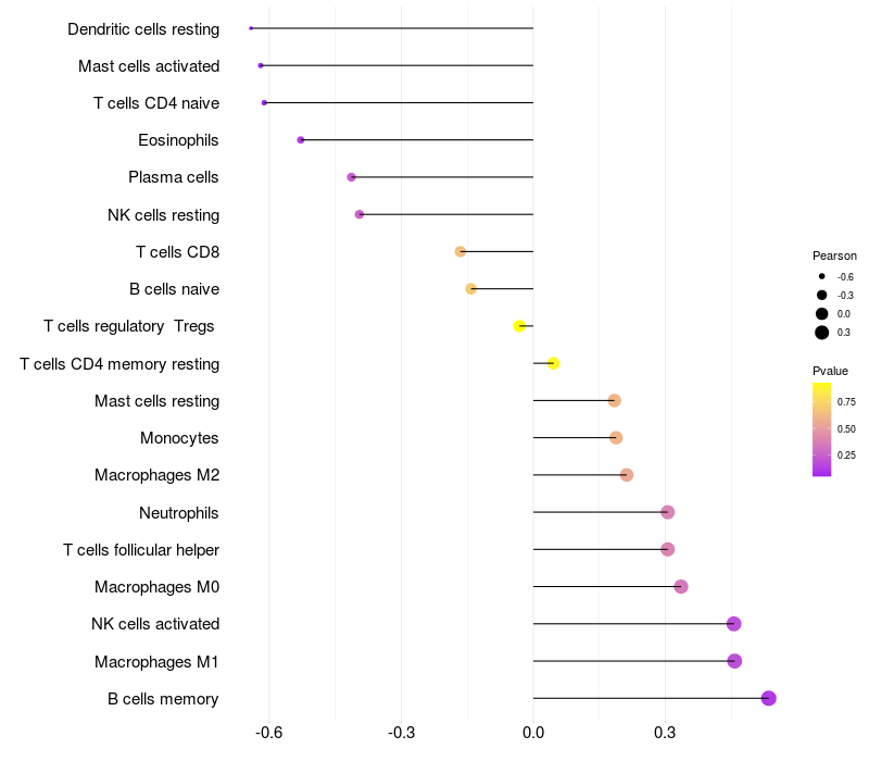 Lollipop of MTDH expression and immune infiltrating cell level correlation result in HBV+ Liver cirrhosis samples