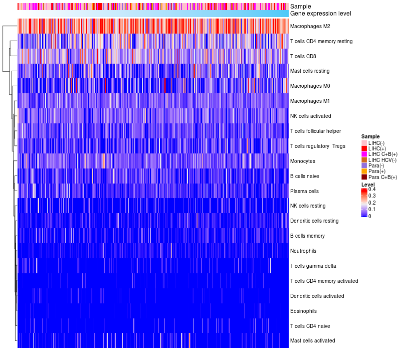 Liver hepatocellular carcinoma HCV (HBV+)(86), Liver hepatocellular carcinoma HCV (HBV-)(19), Liver hepatocellular carcinoma (HBV+)(209), Liver hepatocellular carcinoma (HBV+)(60), Paracancerous HCV (HBV+)(4), Paracancerous (HBV-)(28), Paracancerous (HBV+)(18) |