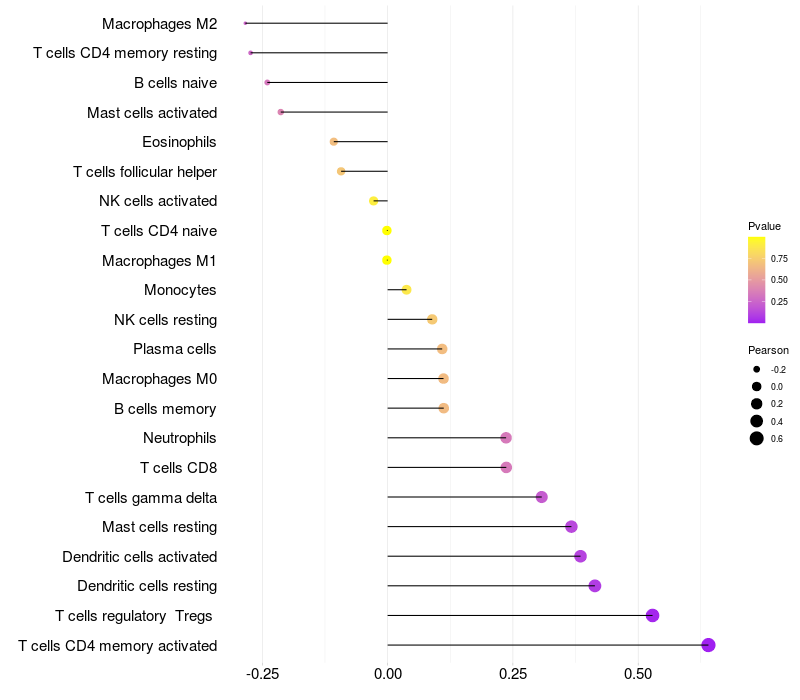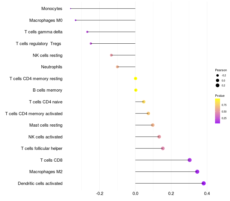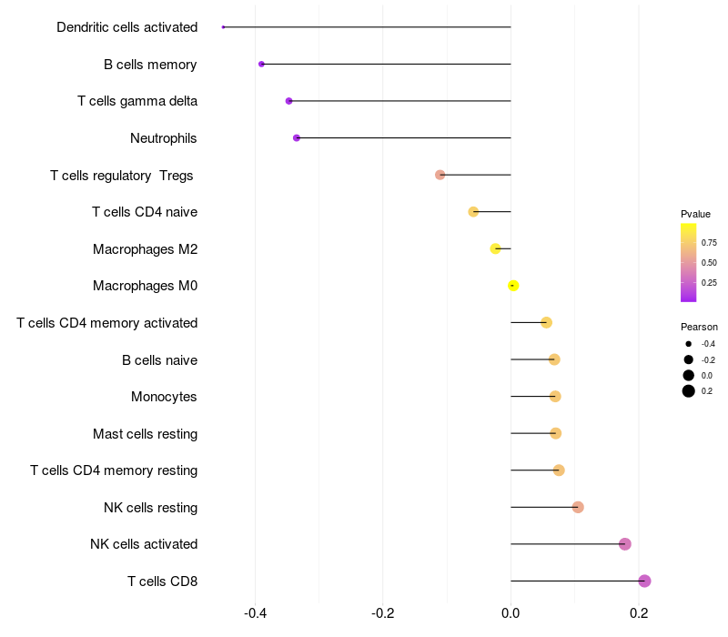 Lollipop of MTF2 expression and immune infiltrating cell level correlation result in HTLV1+ samples