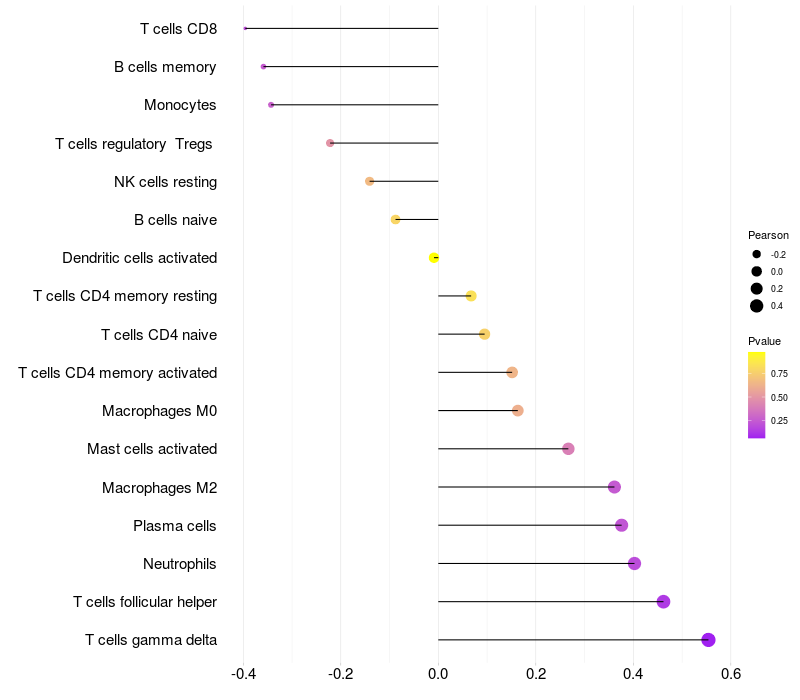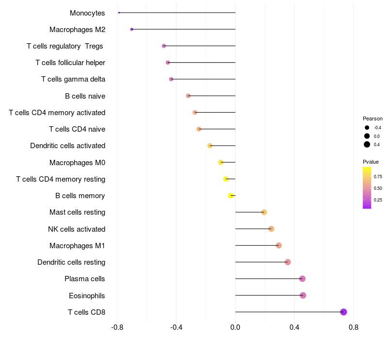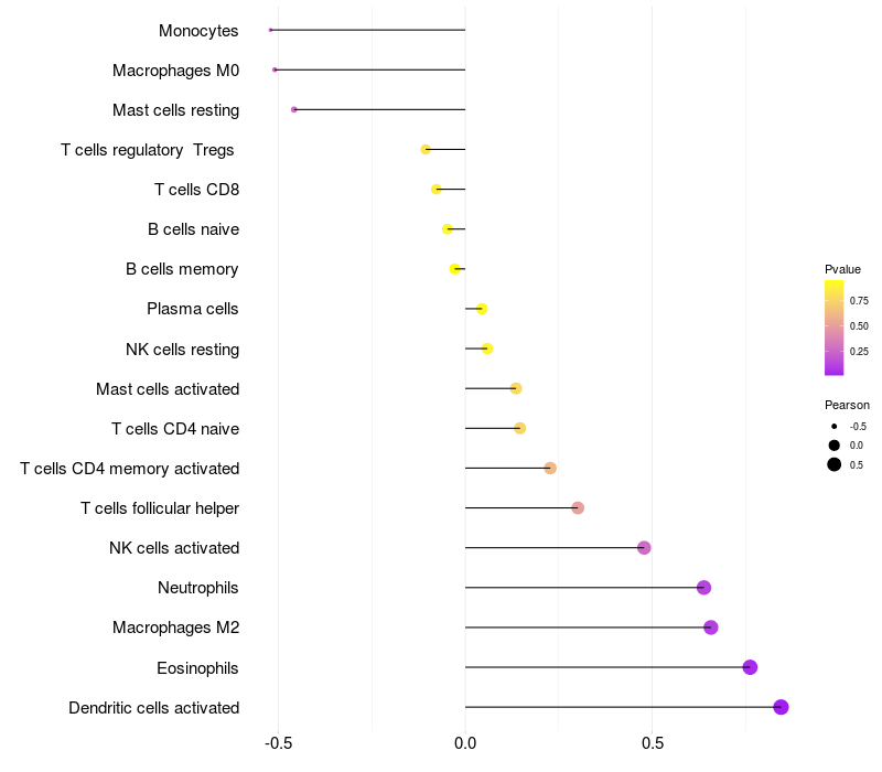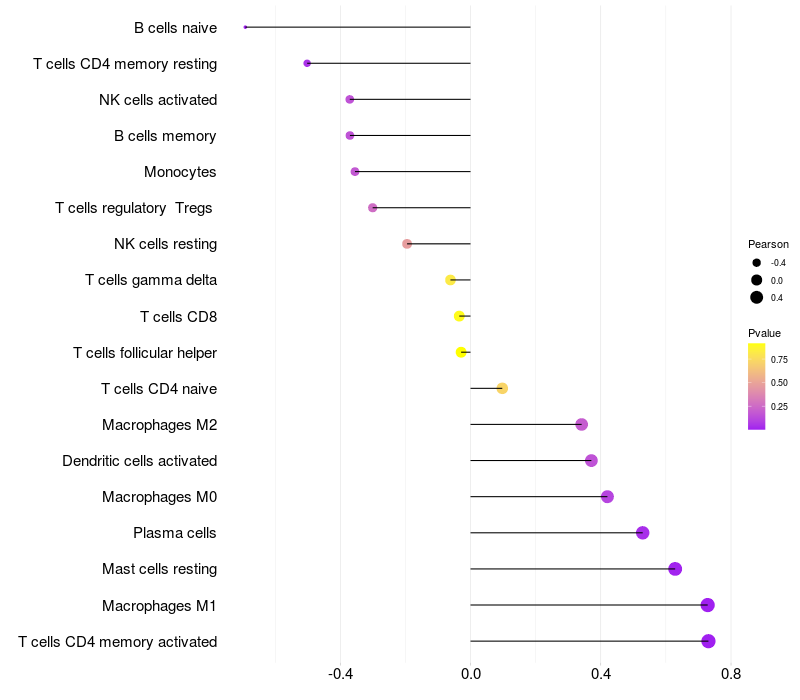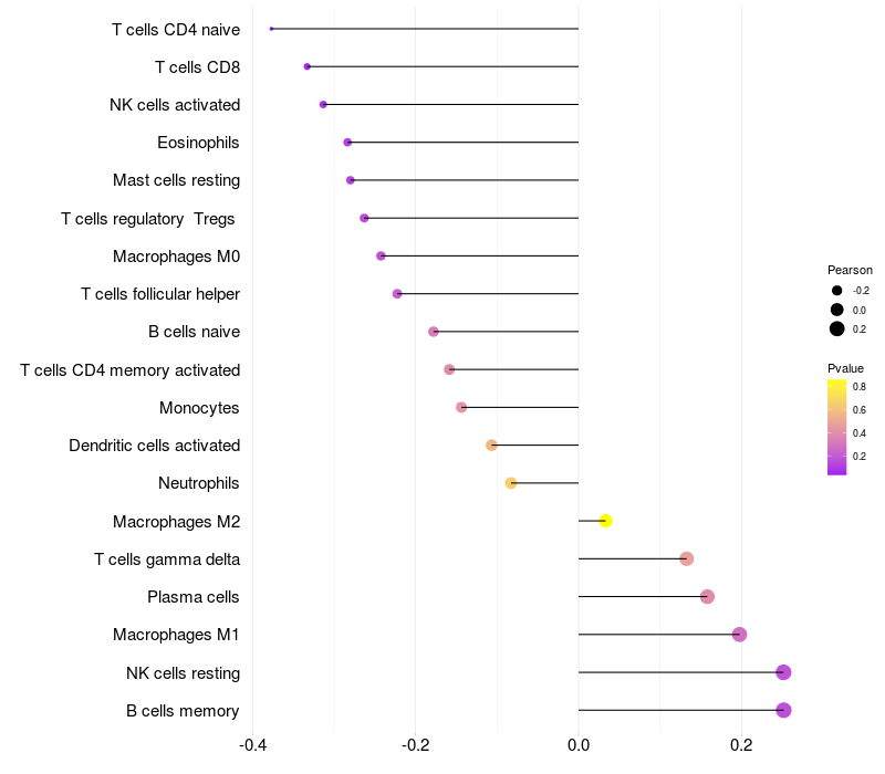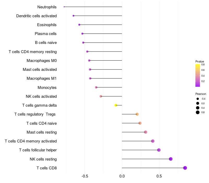 Lollipop of MTG1 expression and immune infiltrating cell level correlation result in EBV+ samples