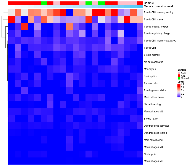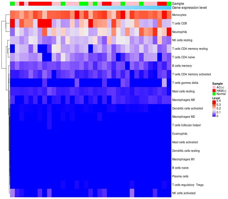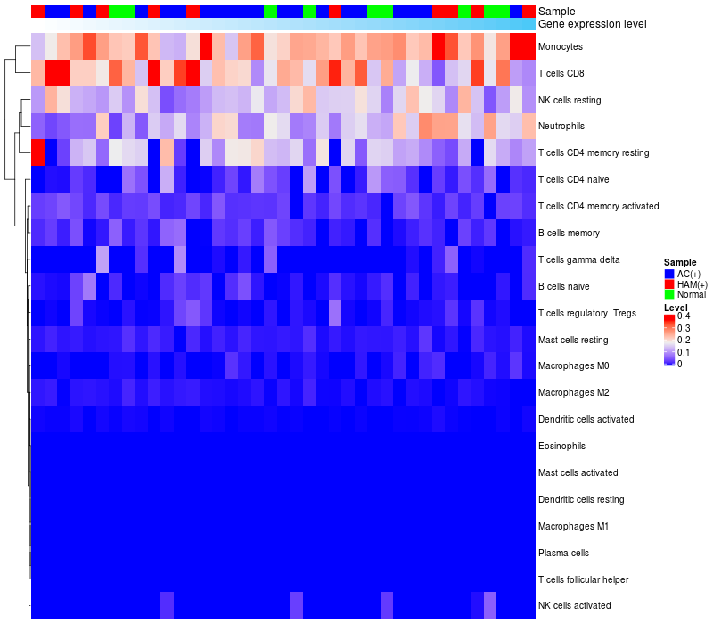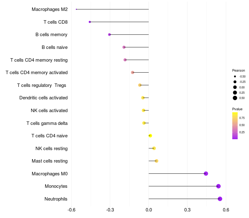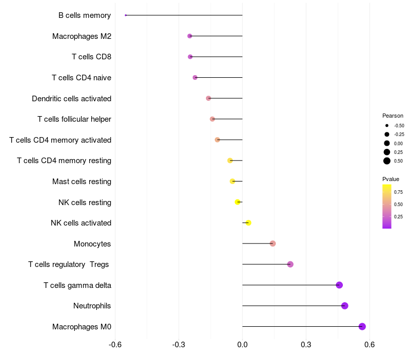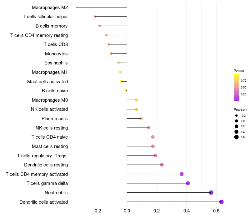 Lollipop of MTHFS expression and immune infiltrating cell level correlation result in HTLV1+ samples