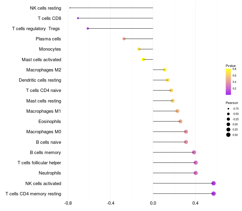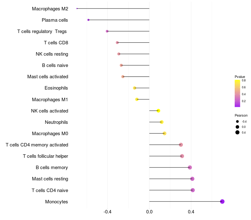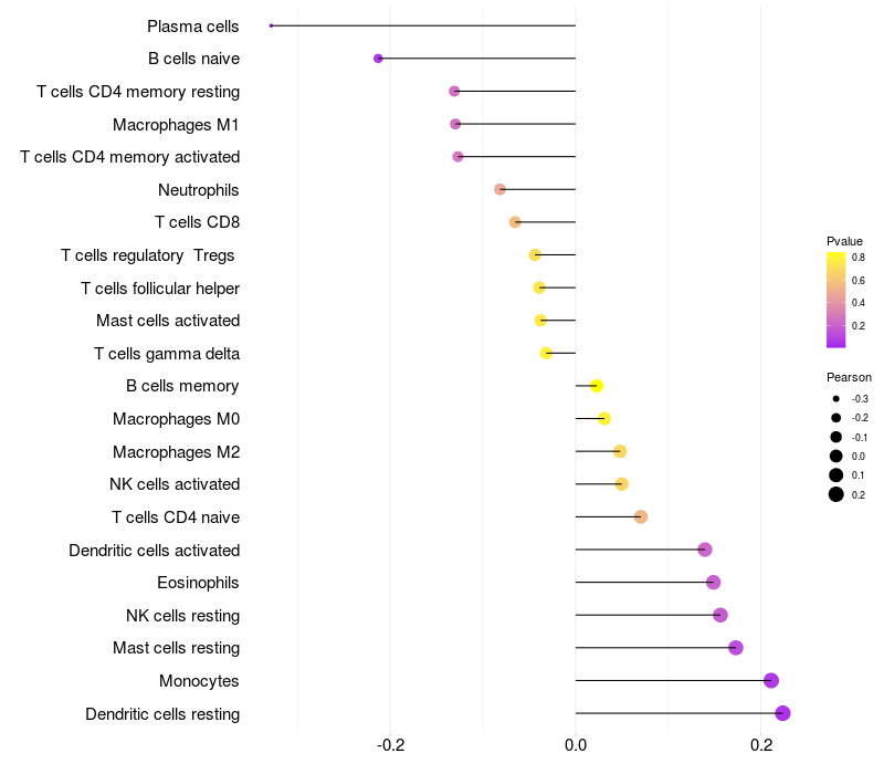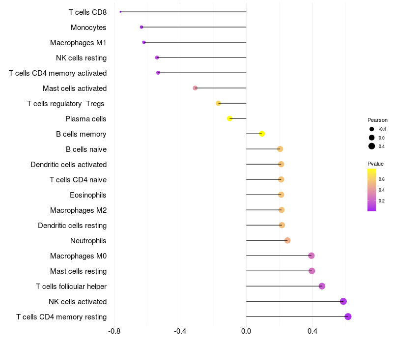 Lollipop of MTIF2 expression and immune infiltrating cell level correlation result in HBV+ Liver cirrhosis samples