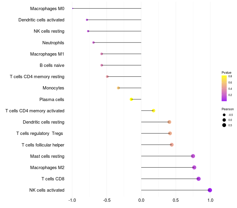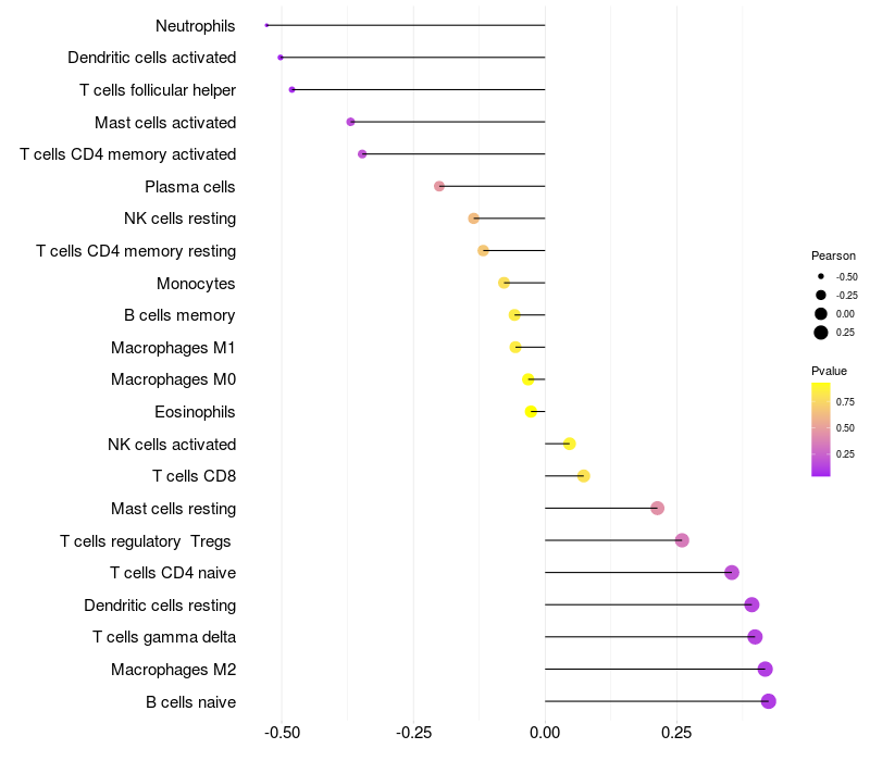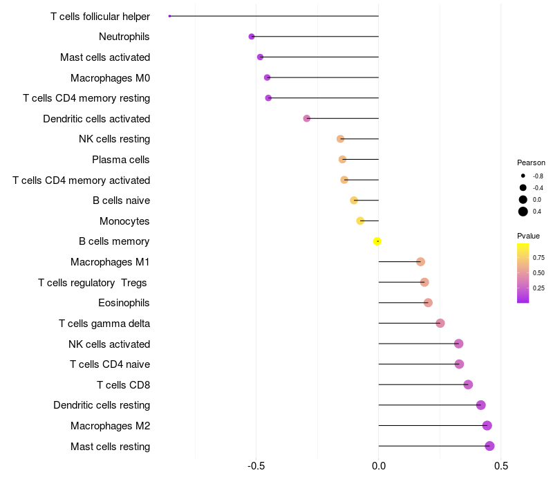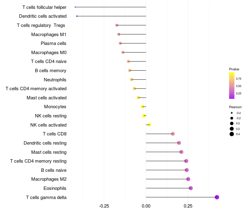 Lollipop of MTRNR2L5 expression and immune infiltrating cell level correlation result in HPV+ samples
