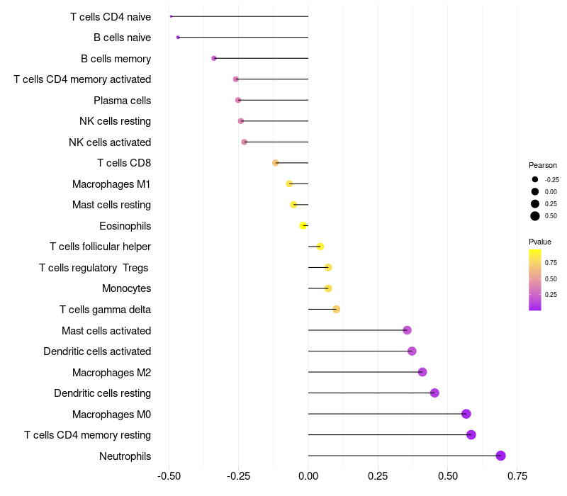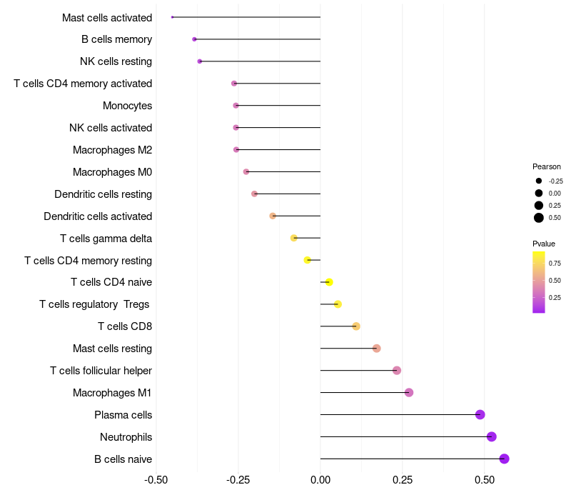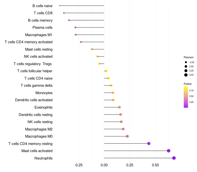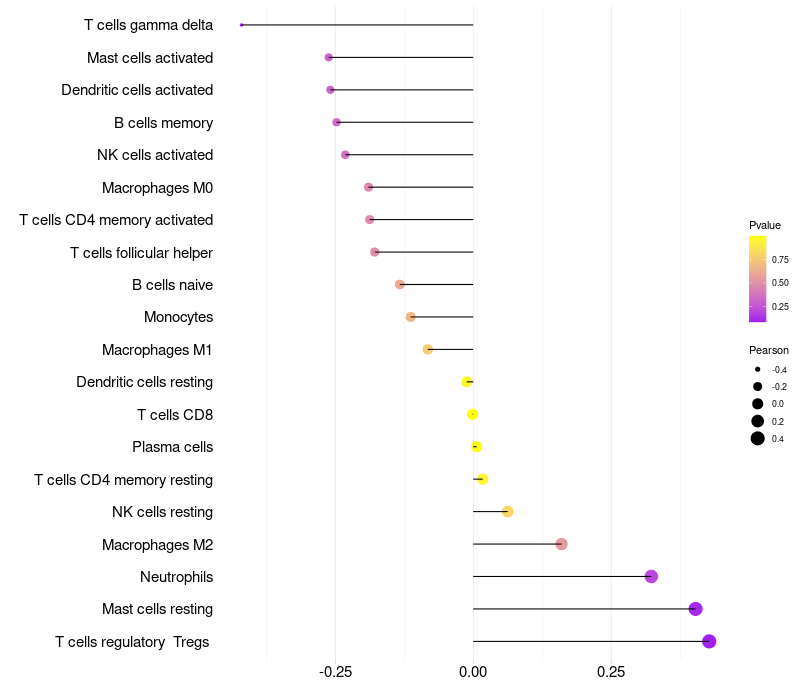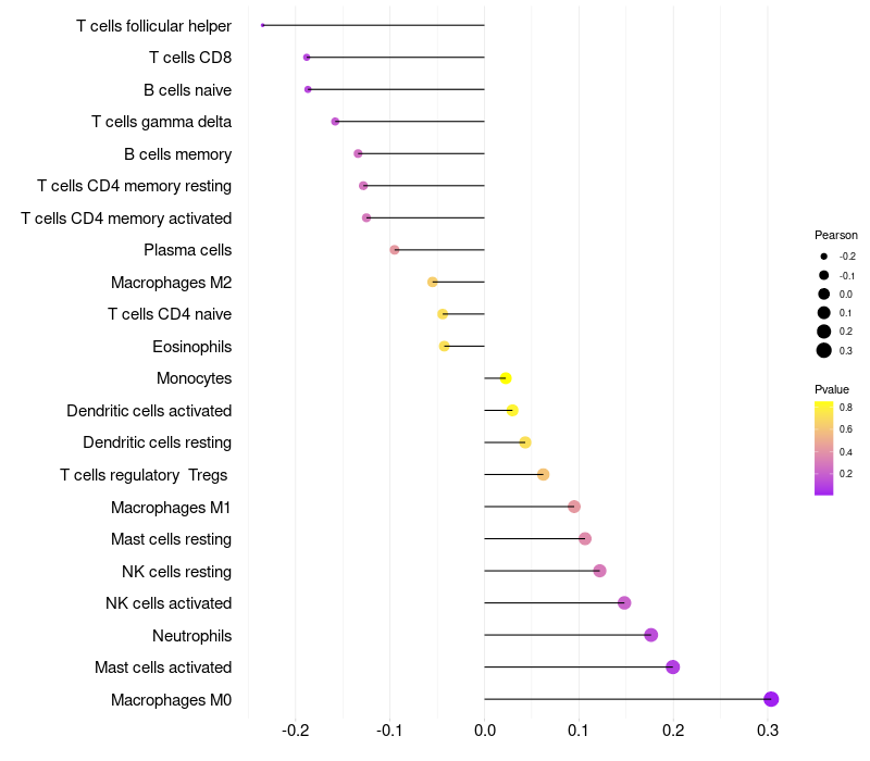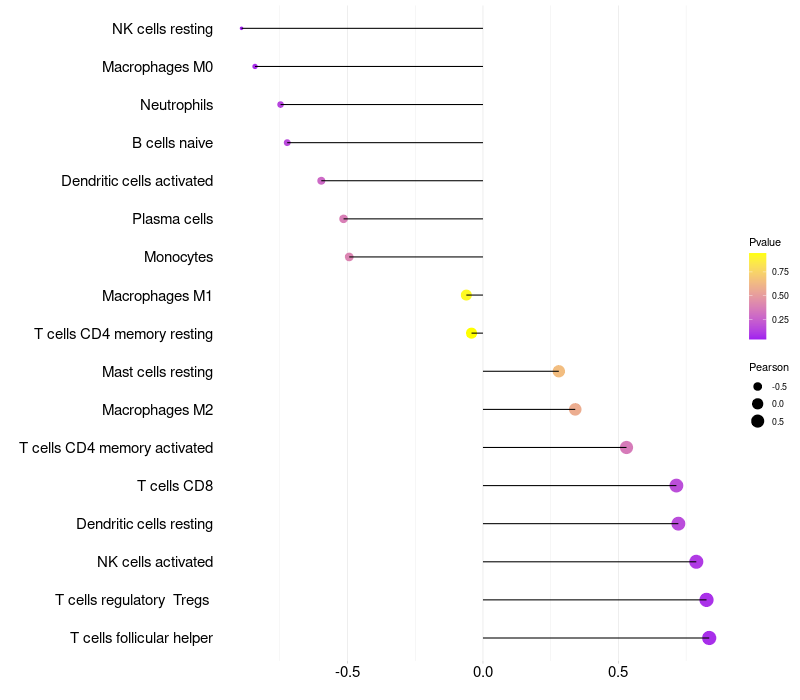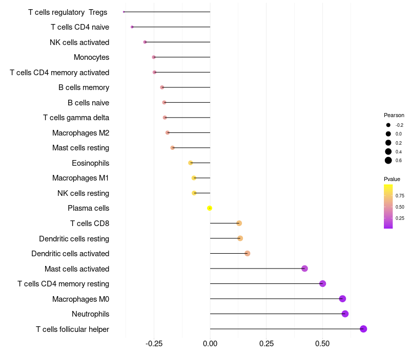 Lollipop of MUCL1 expression and immune infiltrating cell level correlation result in HPV+ samples