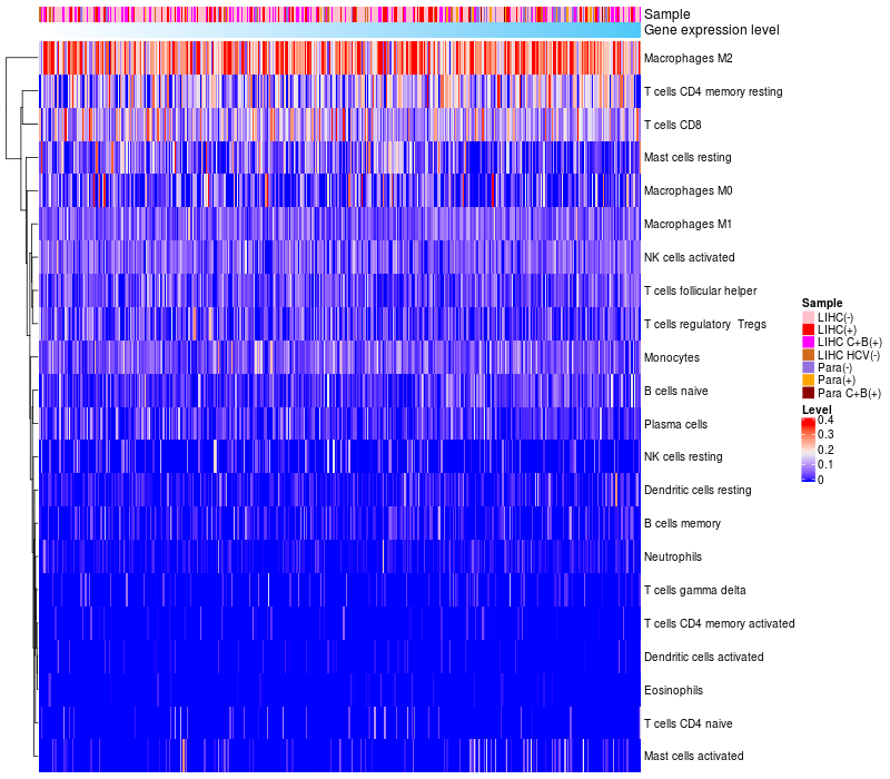 Liver hepatocellular carcinoma HCV (HBV+)(86), Liver hepatocellular carcinoma HCV (HBV-)(19), Liver hepatocellular carcinoma (HBV+)(209), Liver hepatocellular carcinoma (HBV+)(60), Paracancerous HCV (HBV+)(4), Paracancerous (HBV-)(28), Paracancerous (HBV+)(18) |