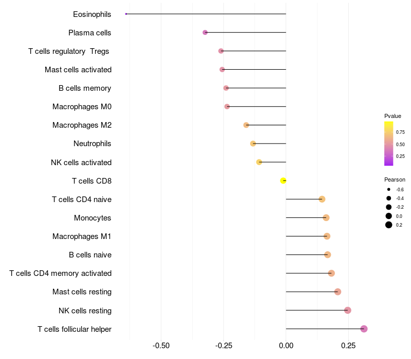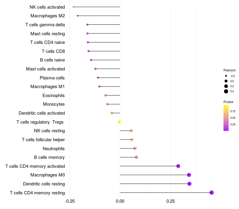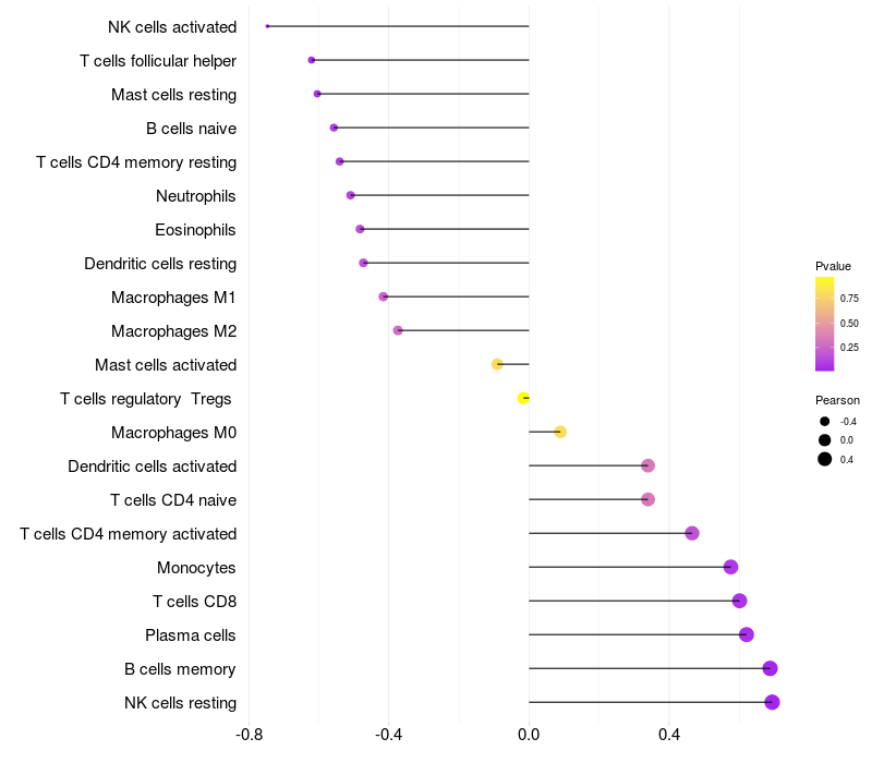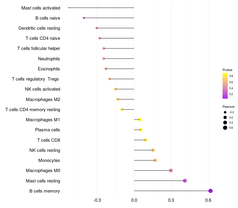 Lollipop of MYBL1 expression and immune infiltrating cell level correlation result in HBV+ Liver cirrhosis samples