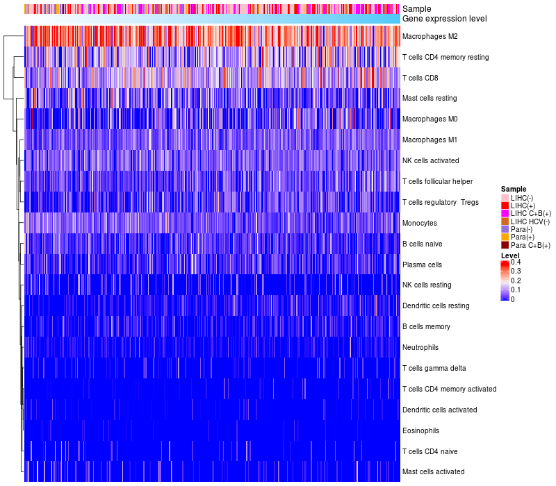 Liver hepatocellular carcinoma HCV (HBV+)(86), Liver hepatocellular carcinoma HCV (HBV-)(19), Liver hepatocellular carcinoma (HBV+)(209), Liver hepatocellular carcinoma (HBV+)(60), Paracancerous HCV (HBV+)(4), Paracancerous (HBV-)(28), Paracancerous (HBV+)(18) |