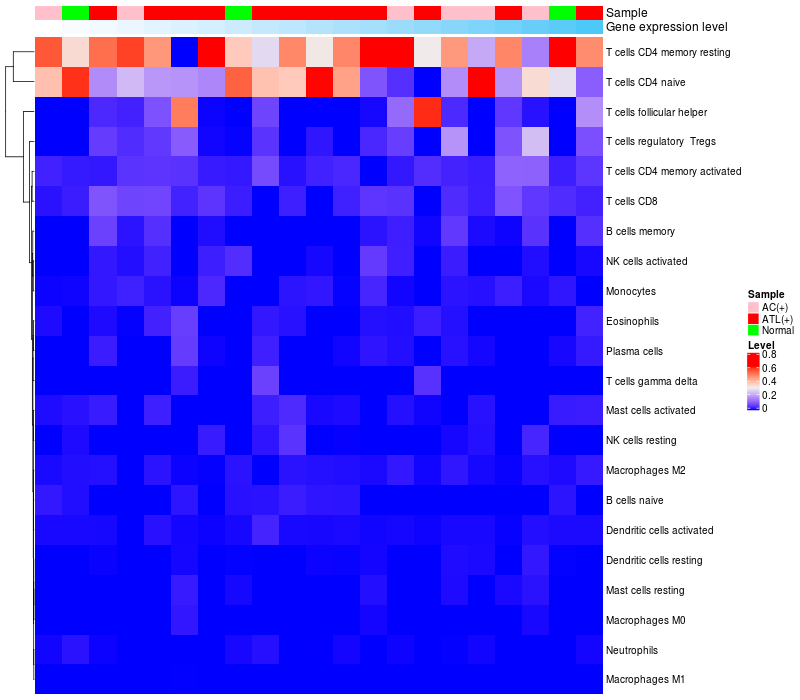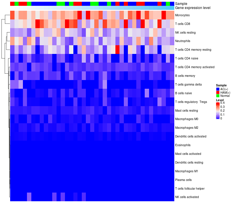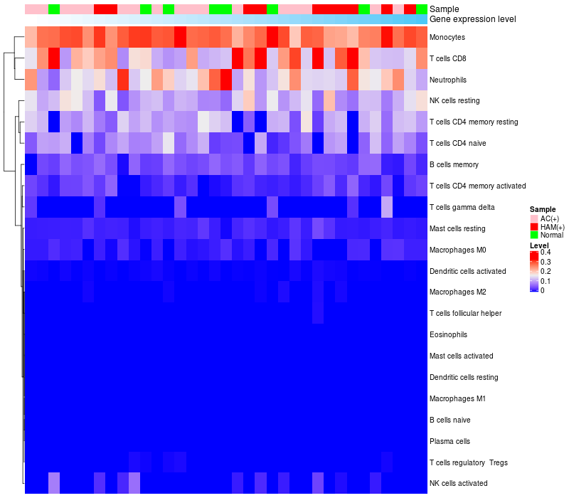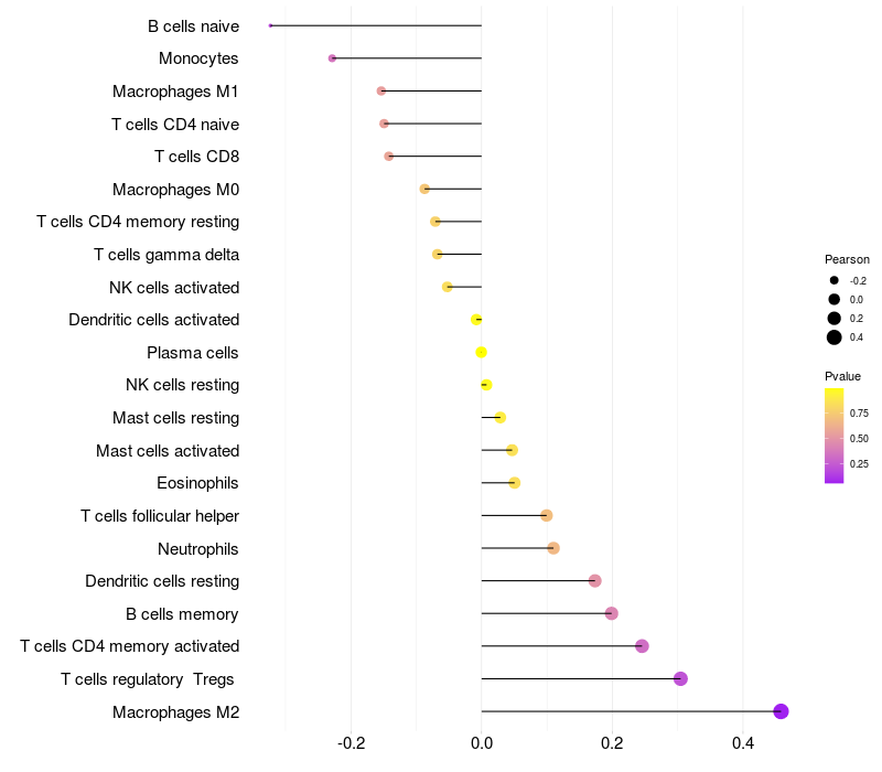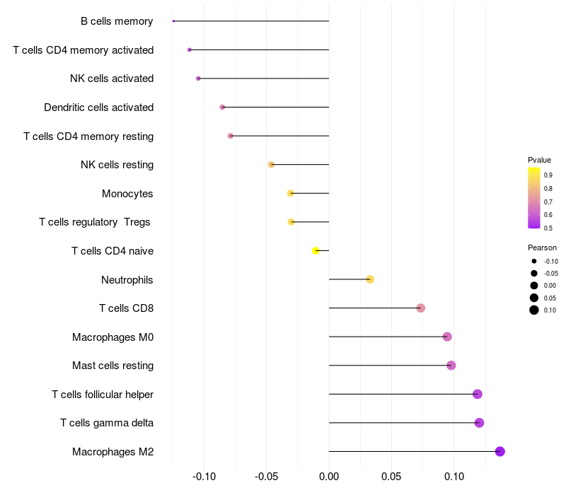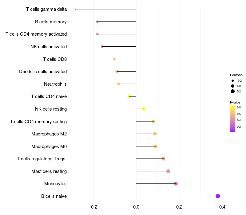Lollipop of MYBPC2 expression and immune infiltrating cell level correlation result in HTLV1+ samples