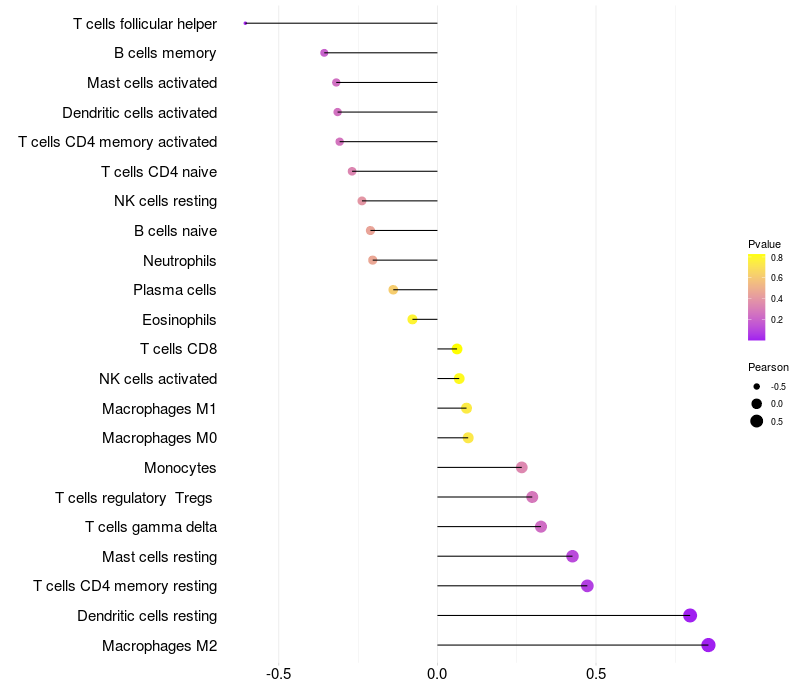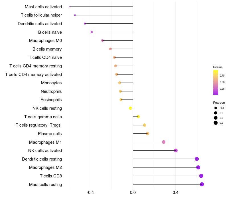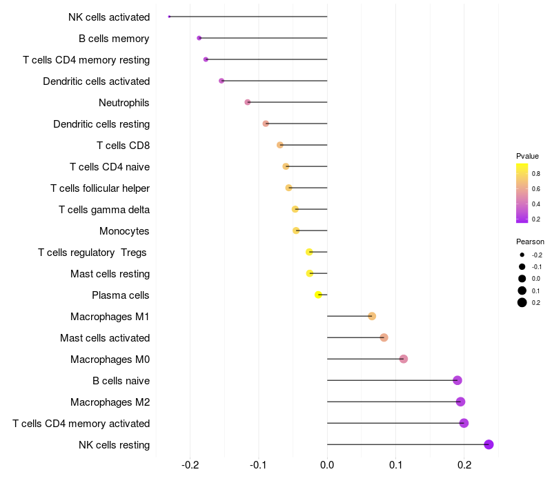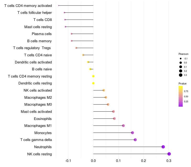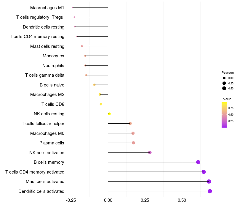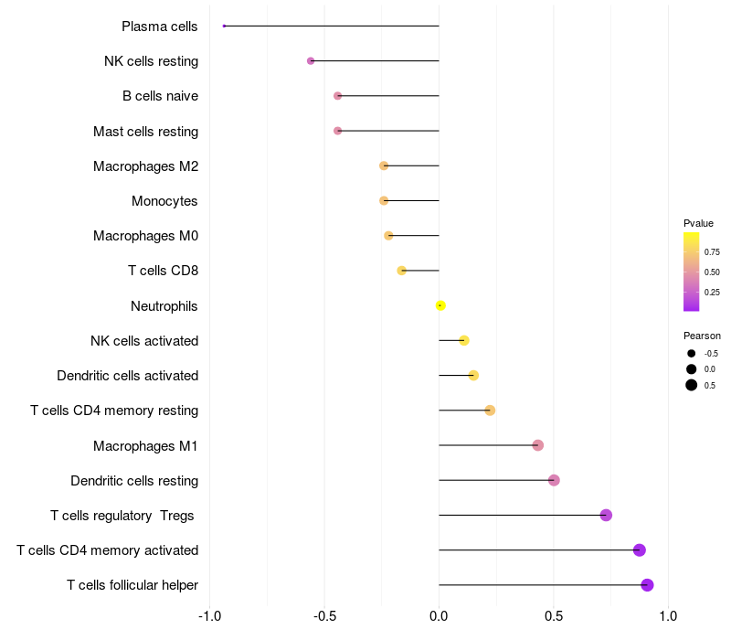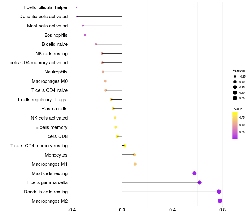 Lollipop of MYF6 expression and immune infiltrating cell level correlation result in HPV+ samples