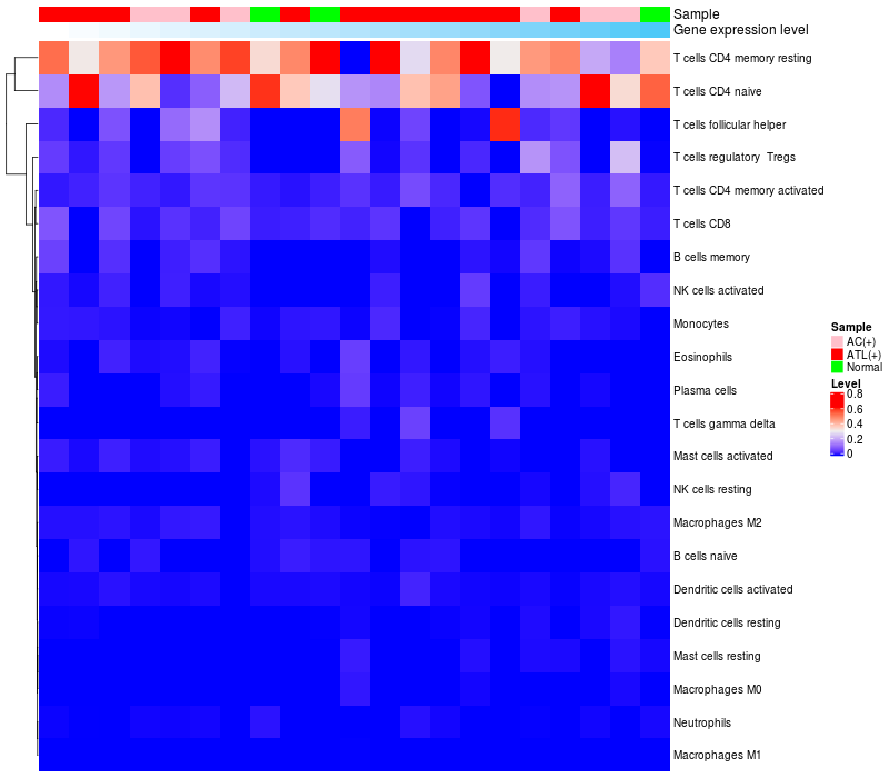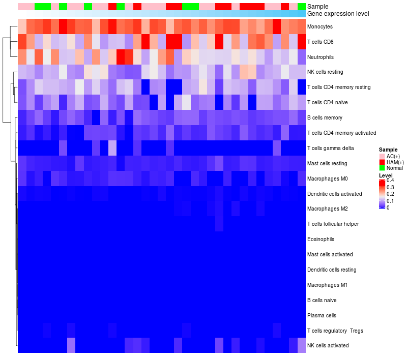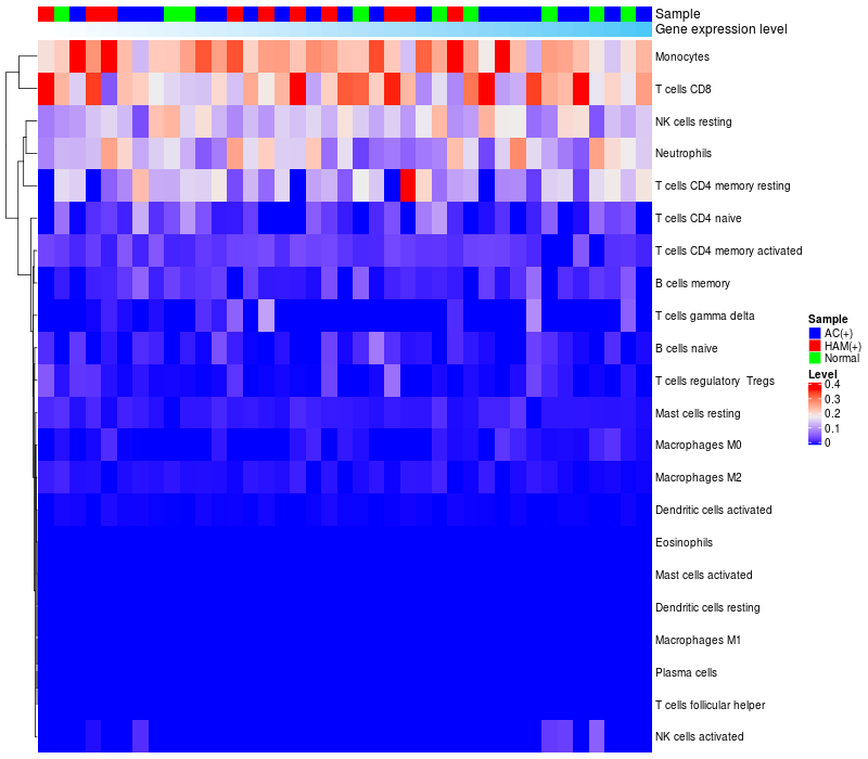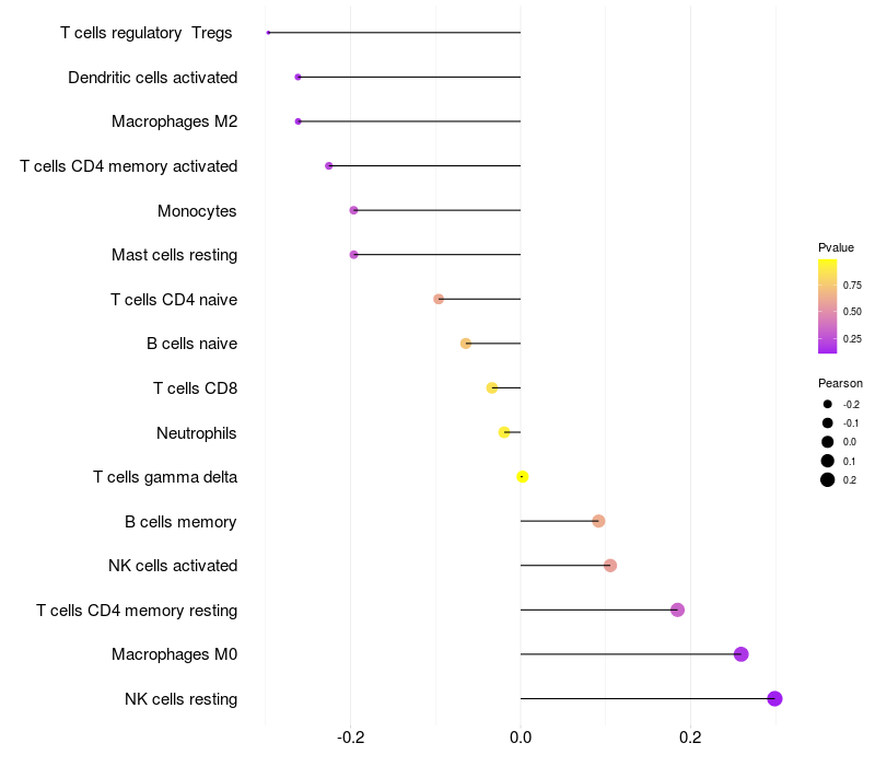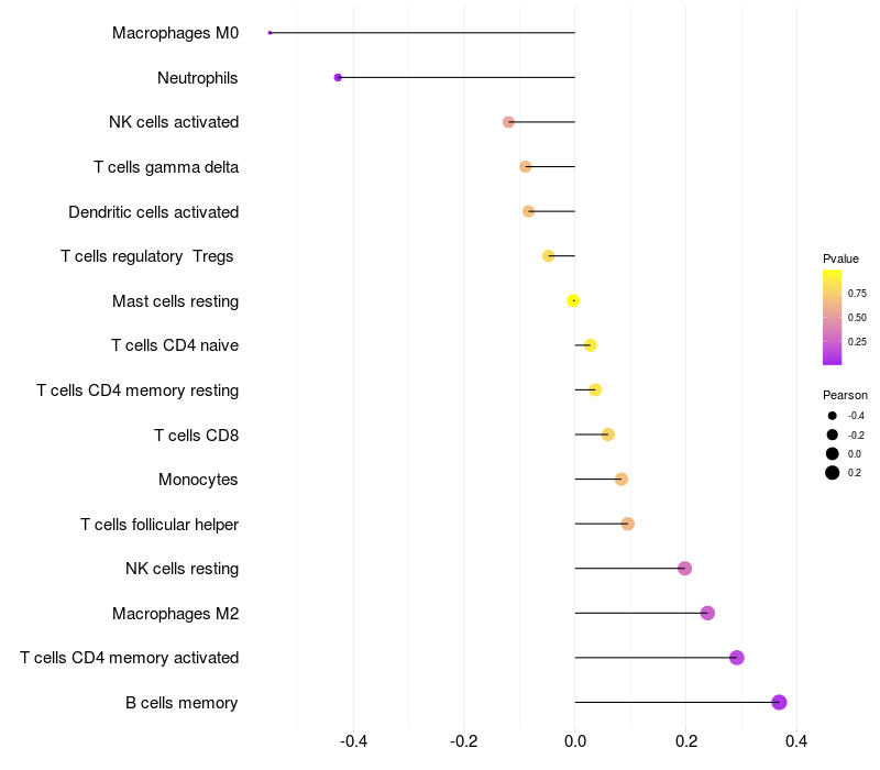 Lollipop of MYH16 expression and immune infiltrating cell level correlation result in HTLV1+ samples