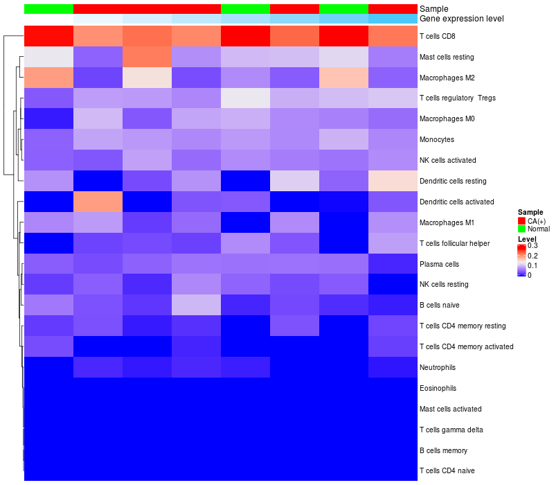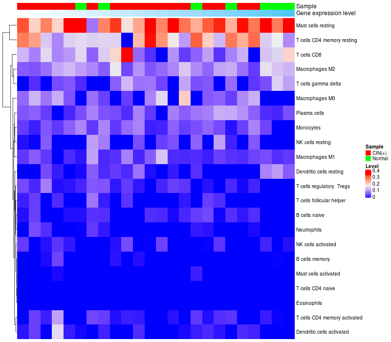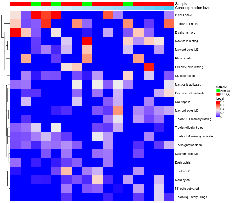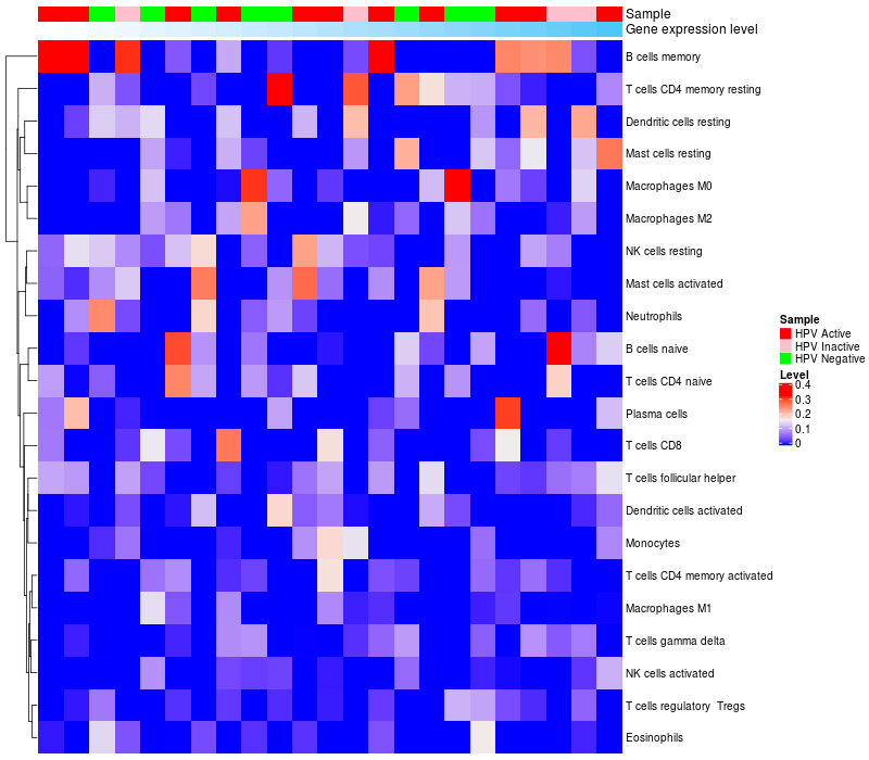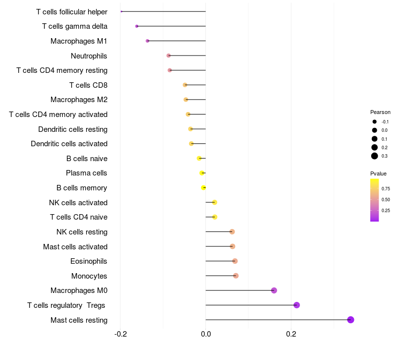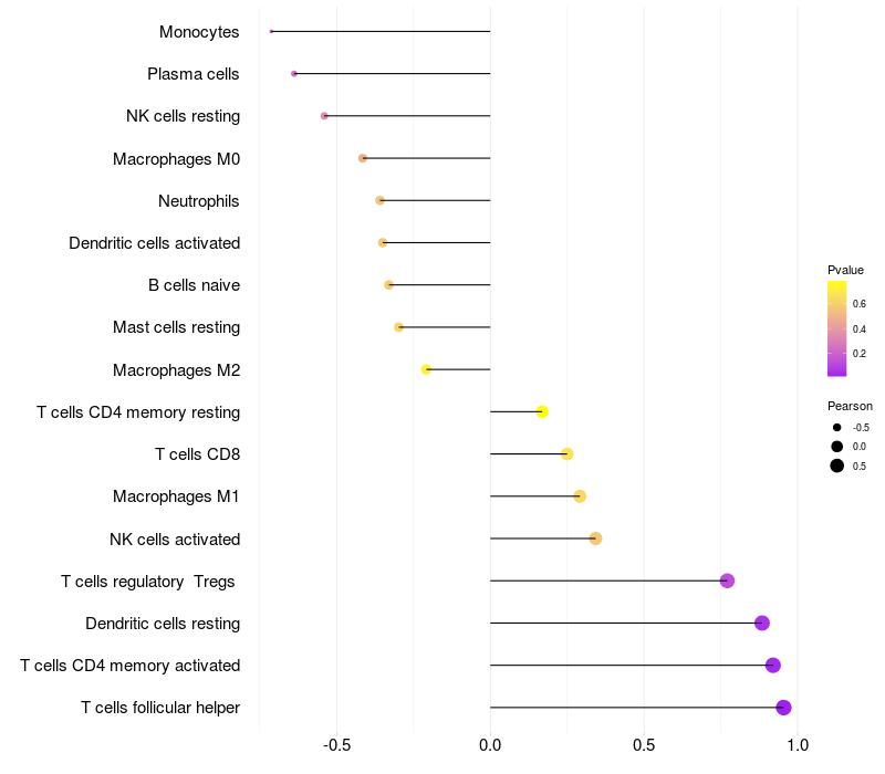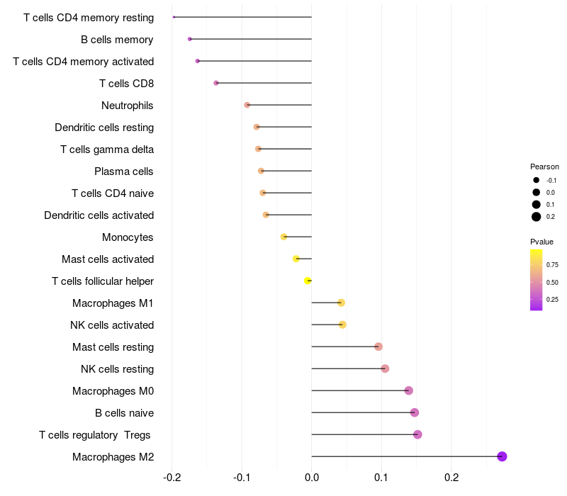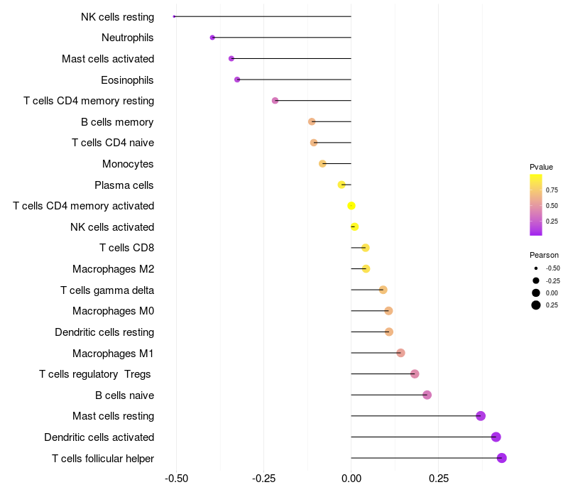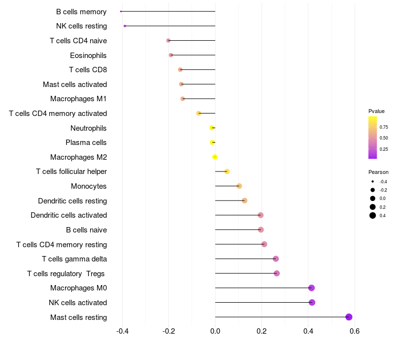 Lollipop of MYH7B expression and immune infiltrating cell level correlation result in HPV+ samples