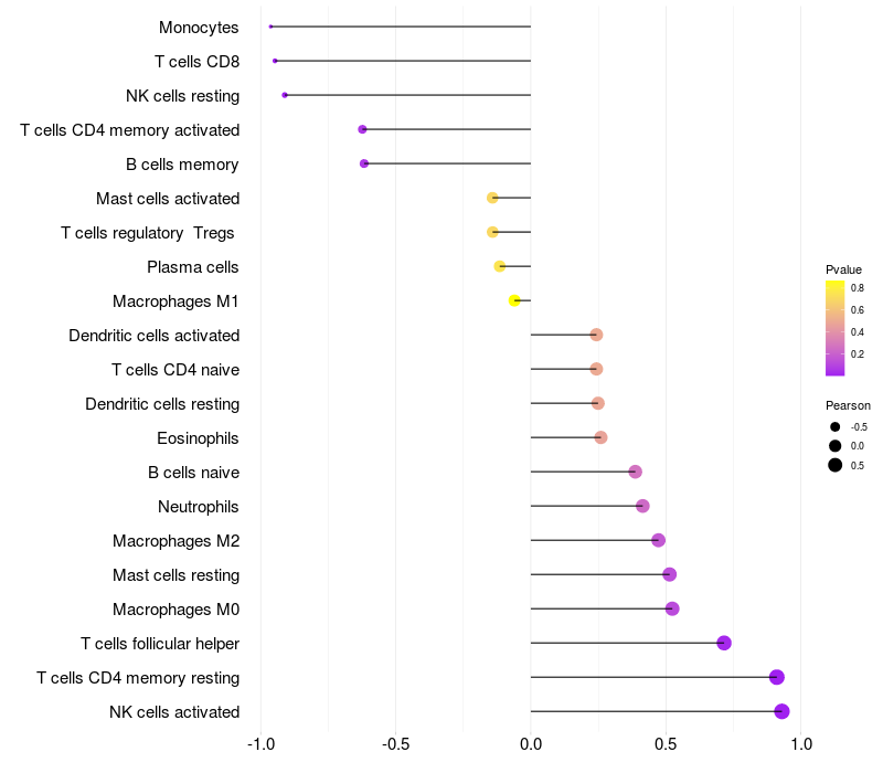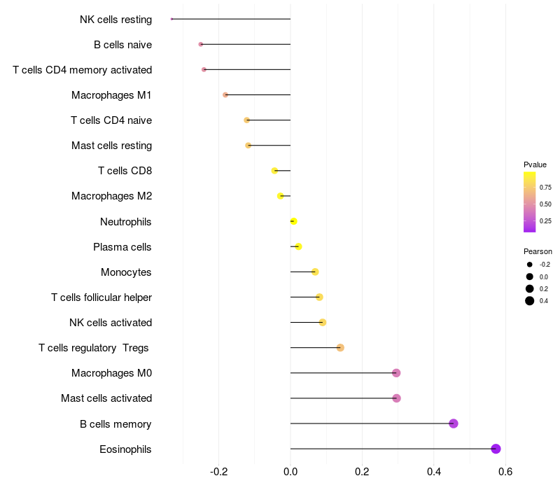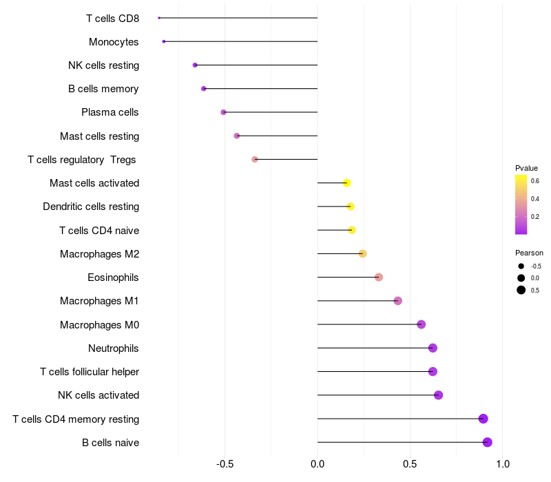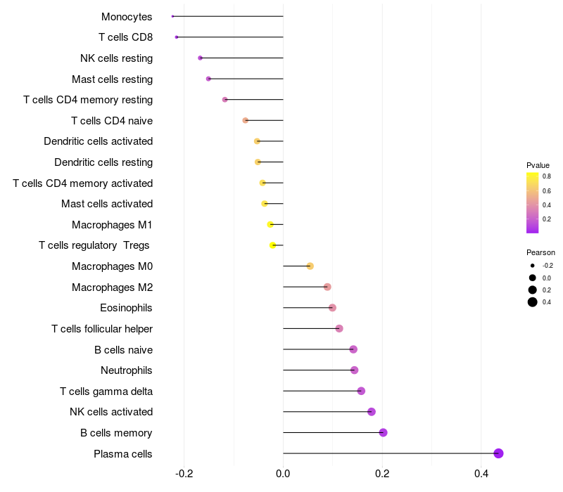 Lollipop of MYO10 expression and immune infiltrating cell level correlation result in HBV+ Liver cirrhosis samples