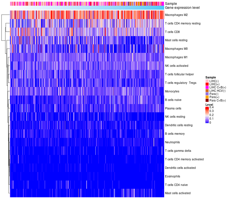 Liver hepatocellular carcinoma HCV (HBV+)(86), Liver hepatocellular carcinoma HCV (HBV-)(19), Liver hepatocellular carcinoma (HBV+)(209), Liver hepatocellular carcinoma (HBV+)(60), Paracancerous HCV (HBV+)(4), Paracancerous (HBV-)(28), Paracancerous (HBV+)(18) |