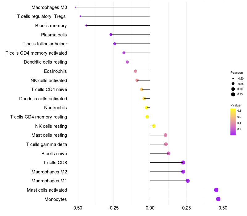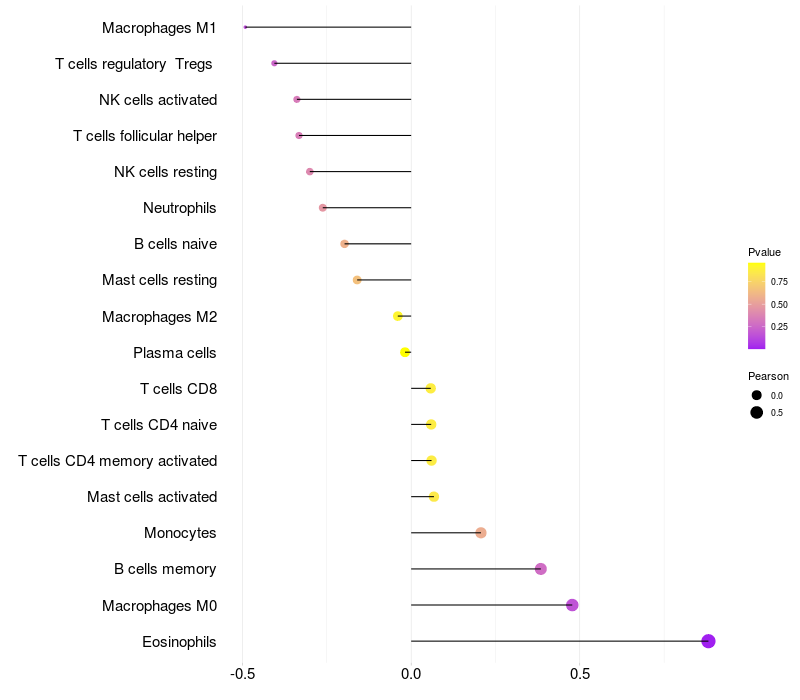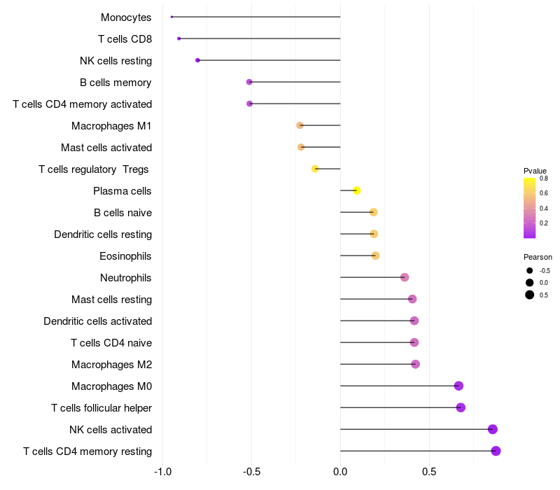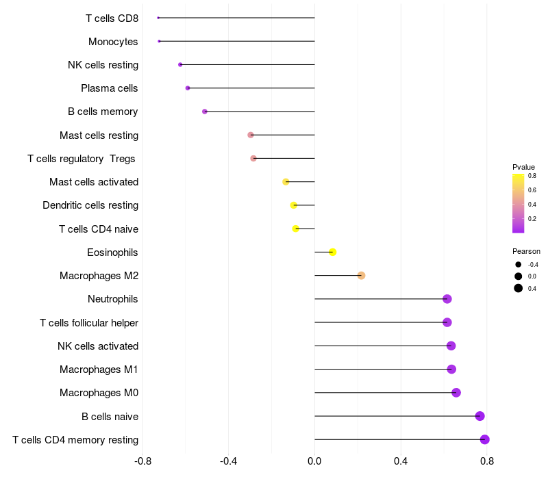 Lollipop of MYO1B expression and immune infiltrating cell level correlation result in HBV+ Liver cirrhosis samples