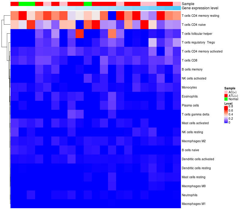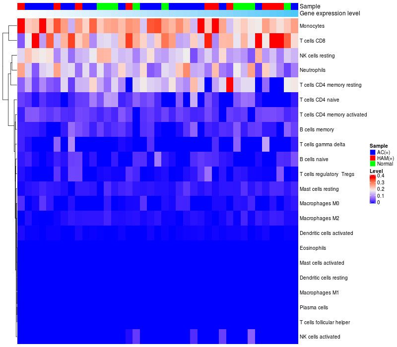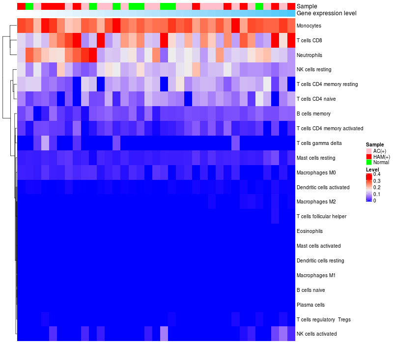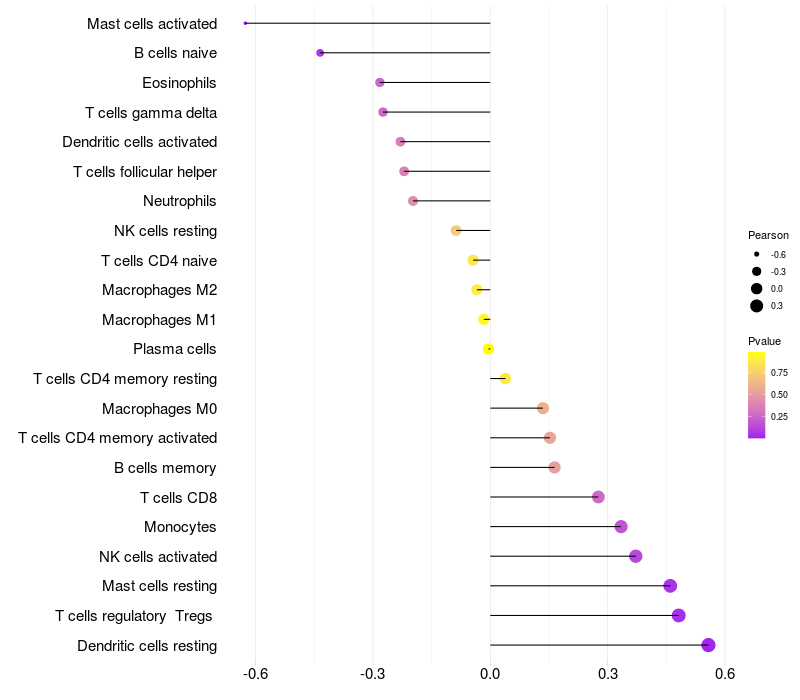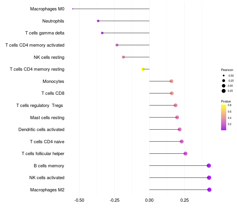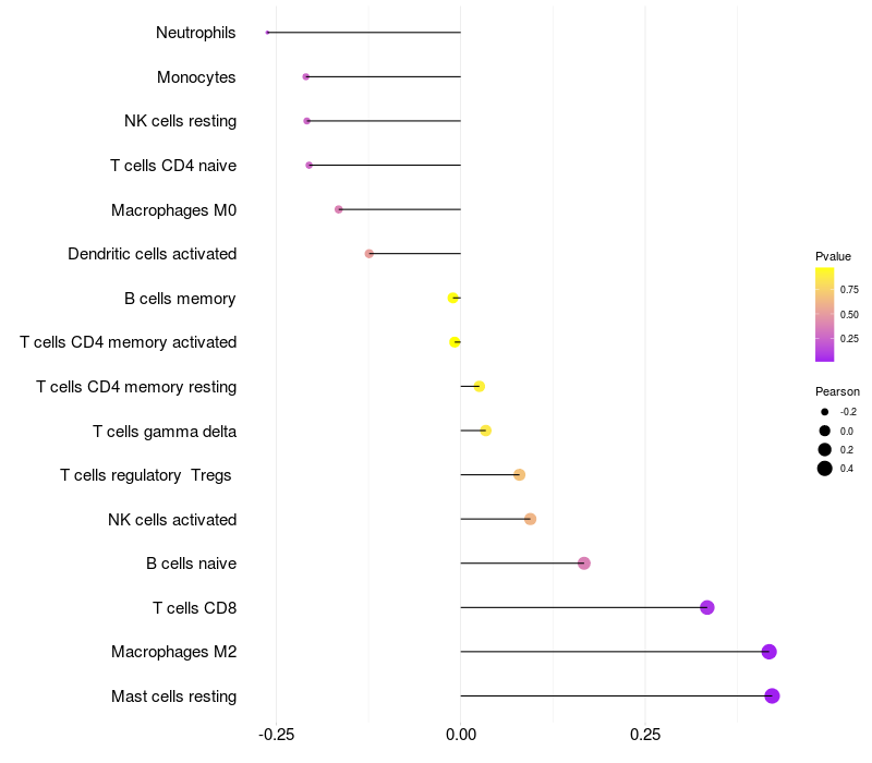 Lollipop of MYO1C expression and immune infiltrating cell level correlation result in HTLV1+ samples