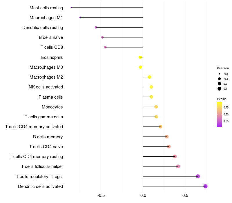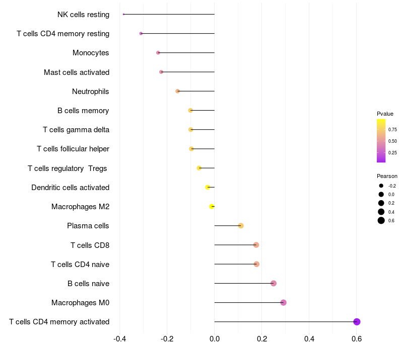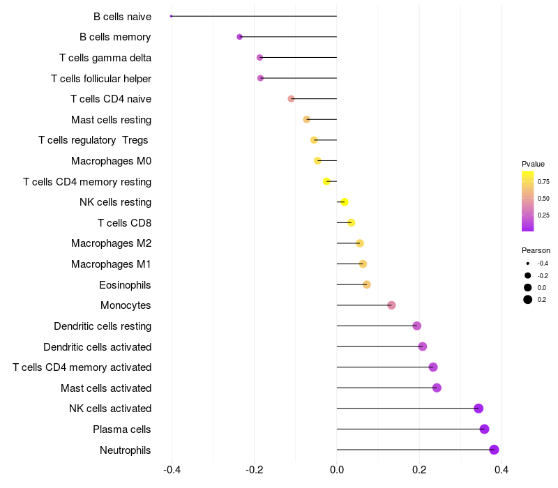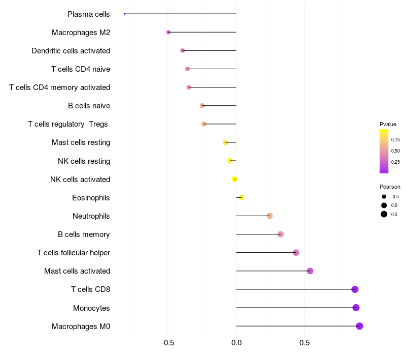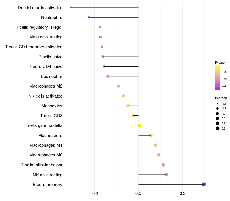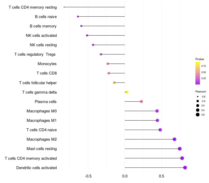 Lollipop of MYO6 expression and immune infiltrating cell level correlation result in EBV+ samples