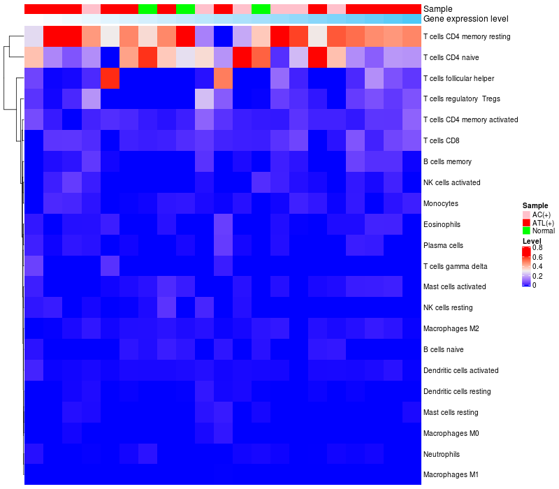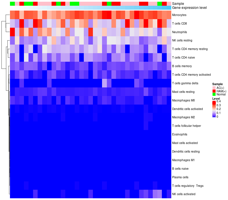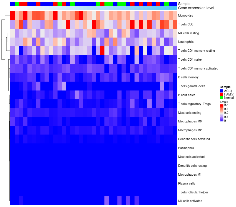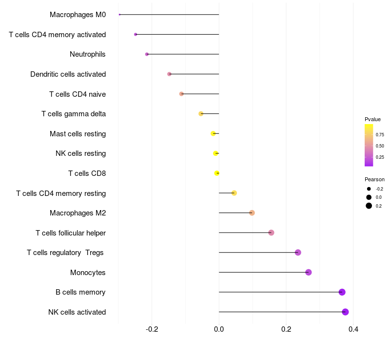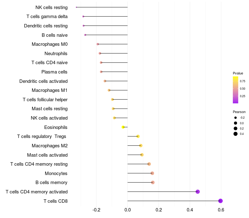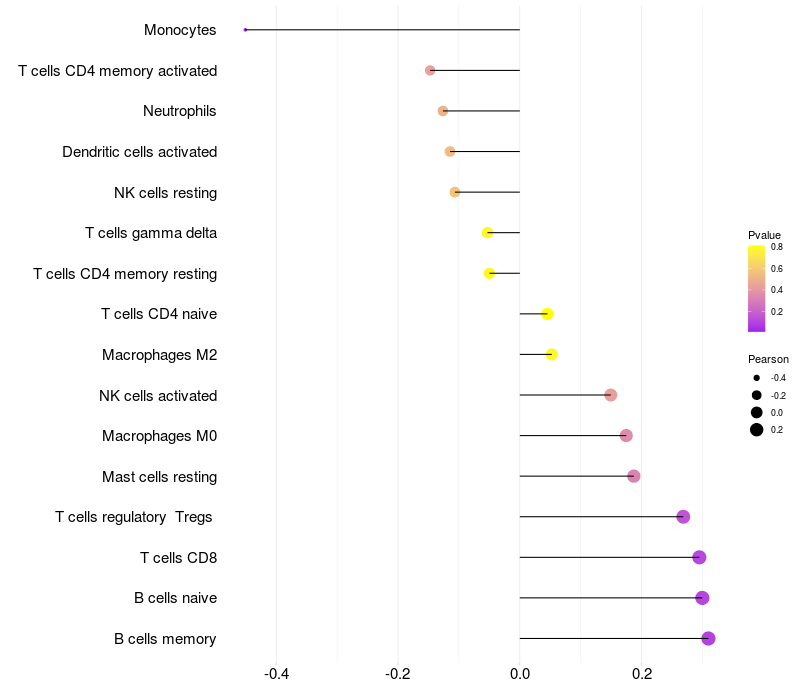 Lollipop of MYOM2 expression and immune infiltrating cell level correlation result in HTLV1+ samples