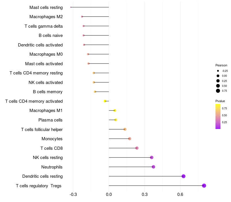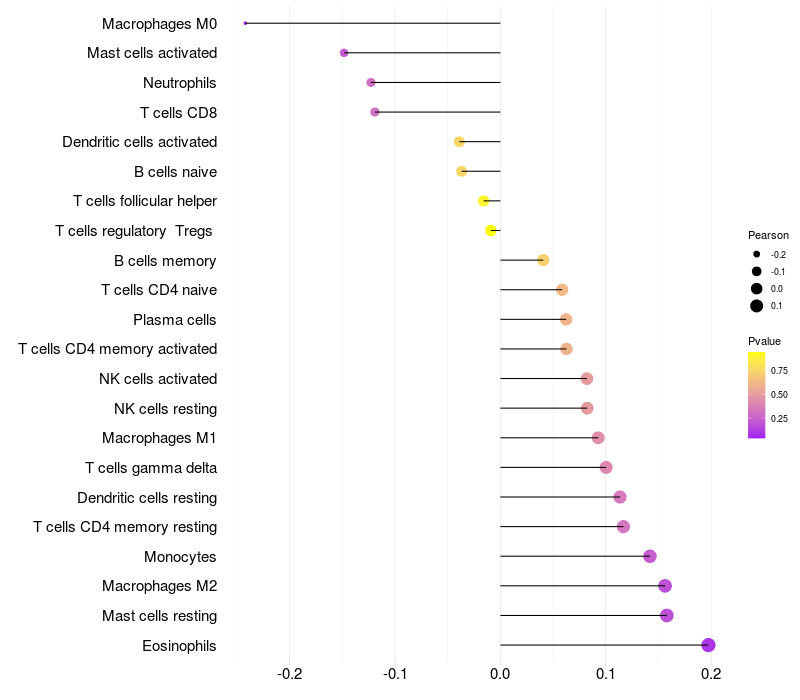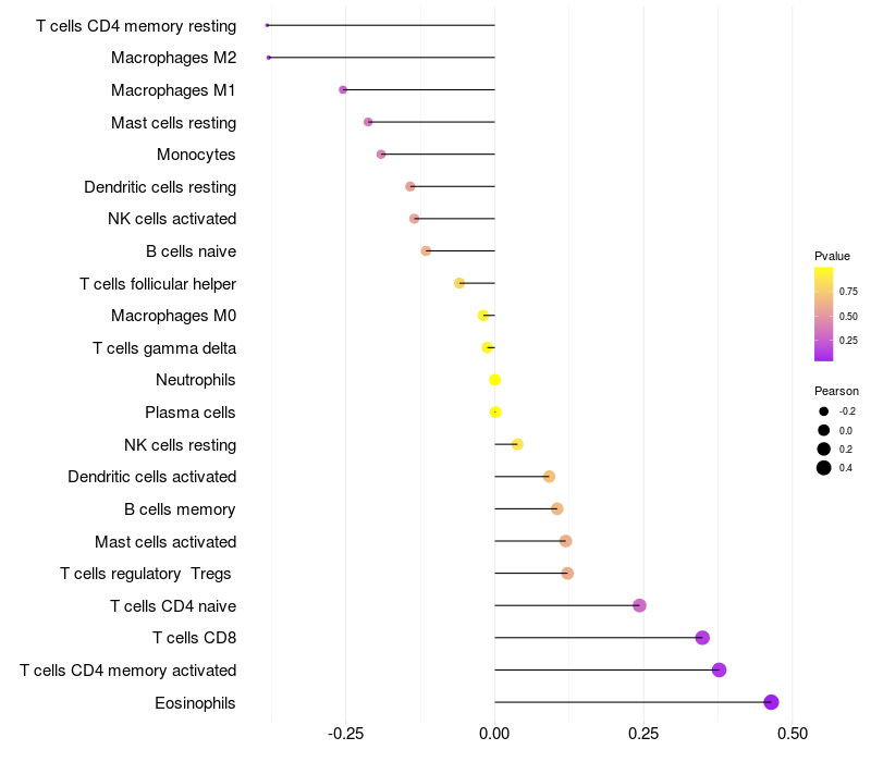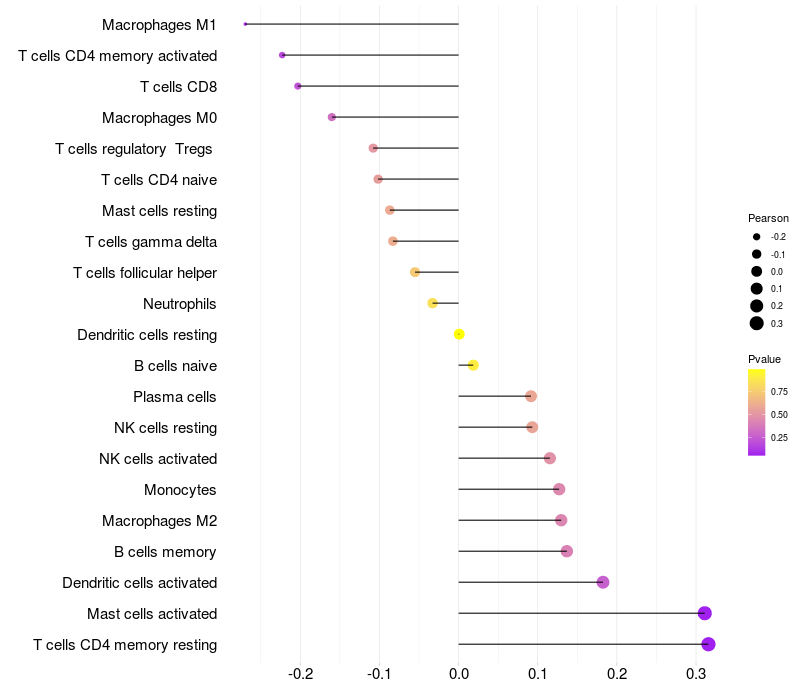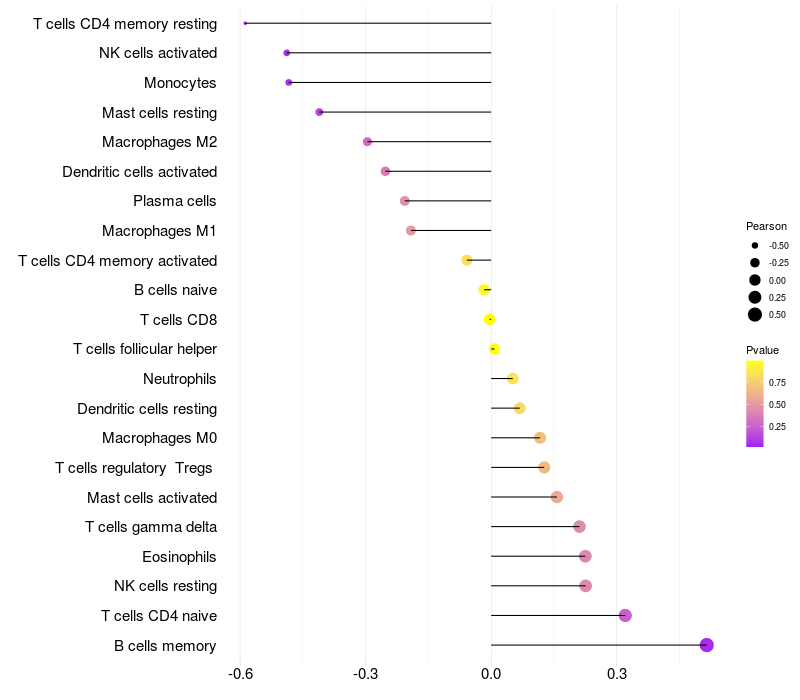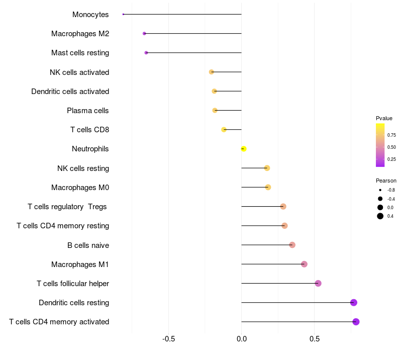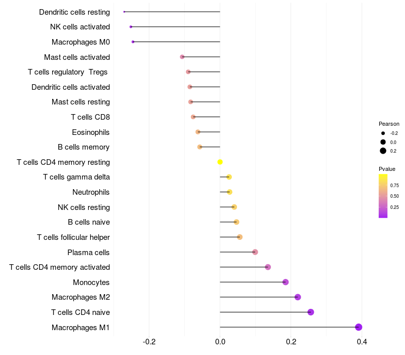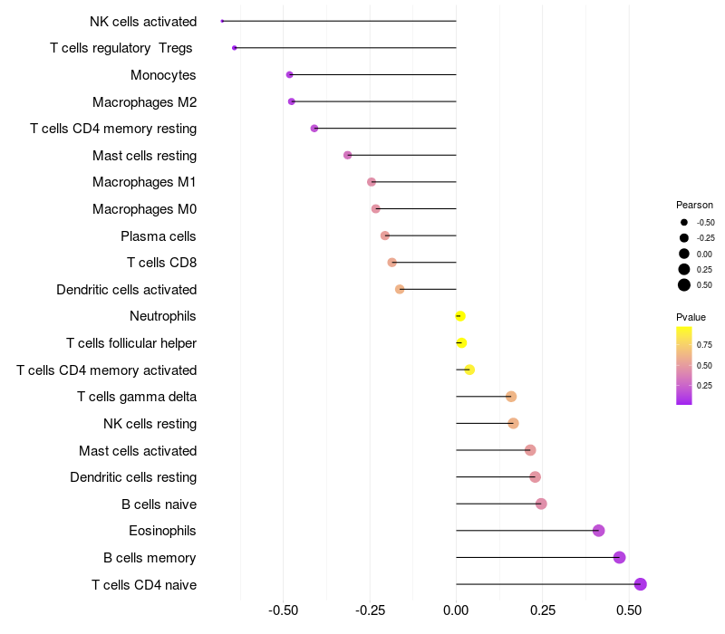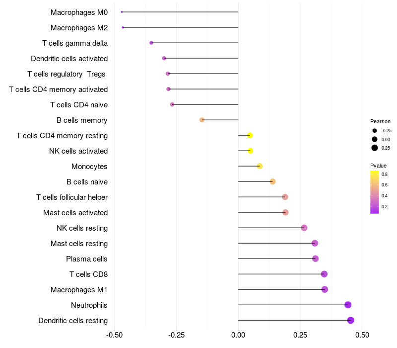 Lollipop of NADSYN1 expression and immune infiltrating cell level correlation result in HPV+ samples