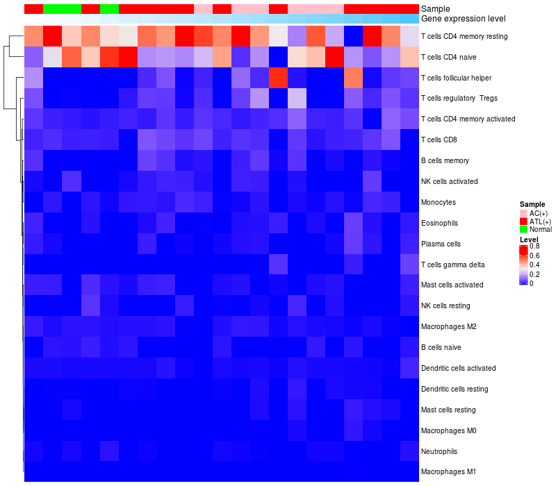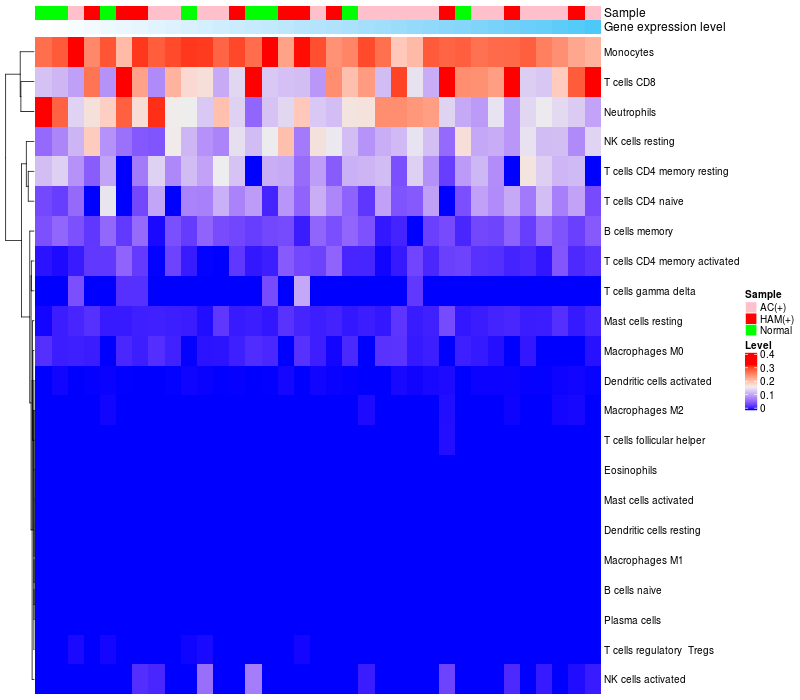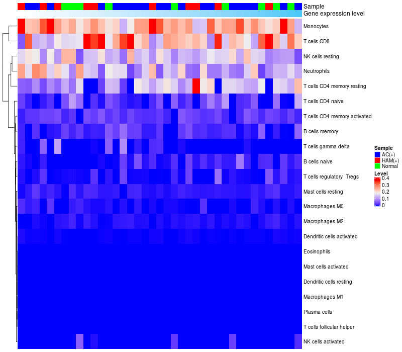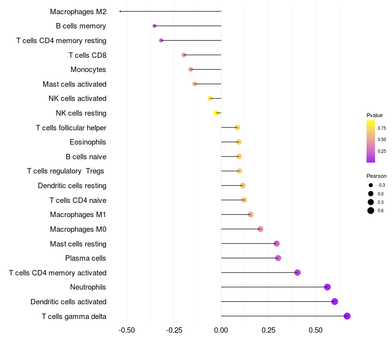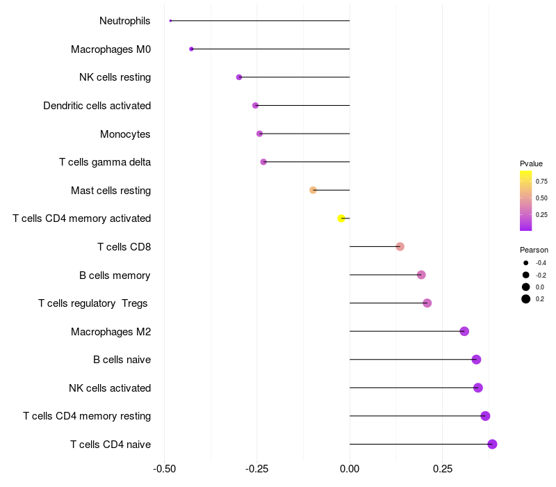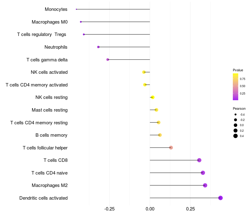 Lollipop of NAP1L1 expression and immune infiltrating cell level correlation result in HTLV1+ samples